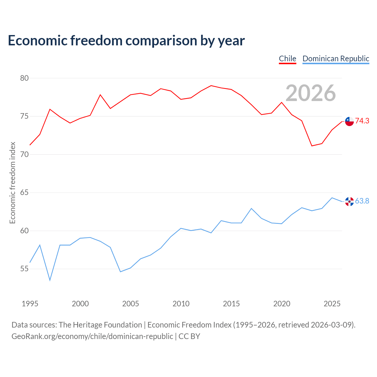 The Economic Freedom Index for Chile is 74.3, ranking 20/197, compared to 63.8 for the Dominican Republic, ranking 77/197. The chart above displays a comparison of annual changes in economic freedom indexes.