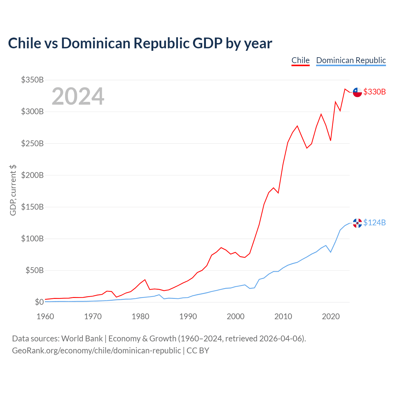 Chile has a GDP of $330B compared to $124B for the Dominican Republic, ranking 45/197 and 63/197 by economy size, respectively.