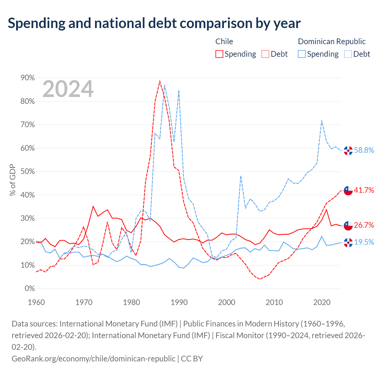 Chile has $138B in government debt (41.7% of GDP), compared to $73.1B (58.8% of GDP) in the Dominican Republic.