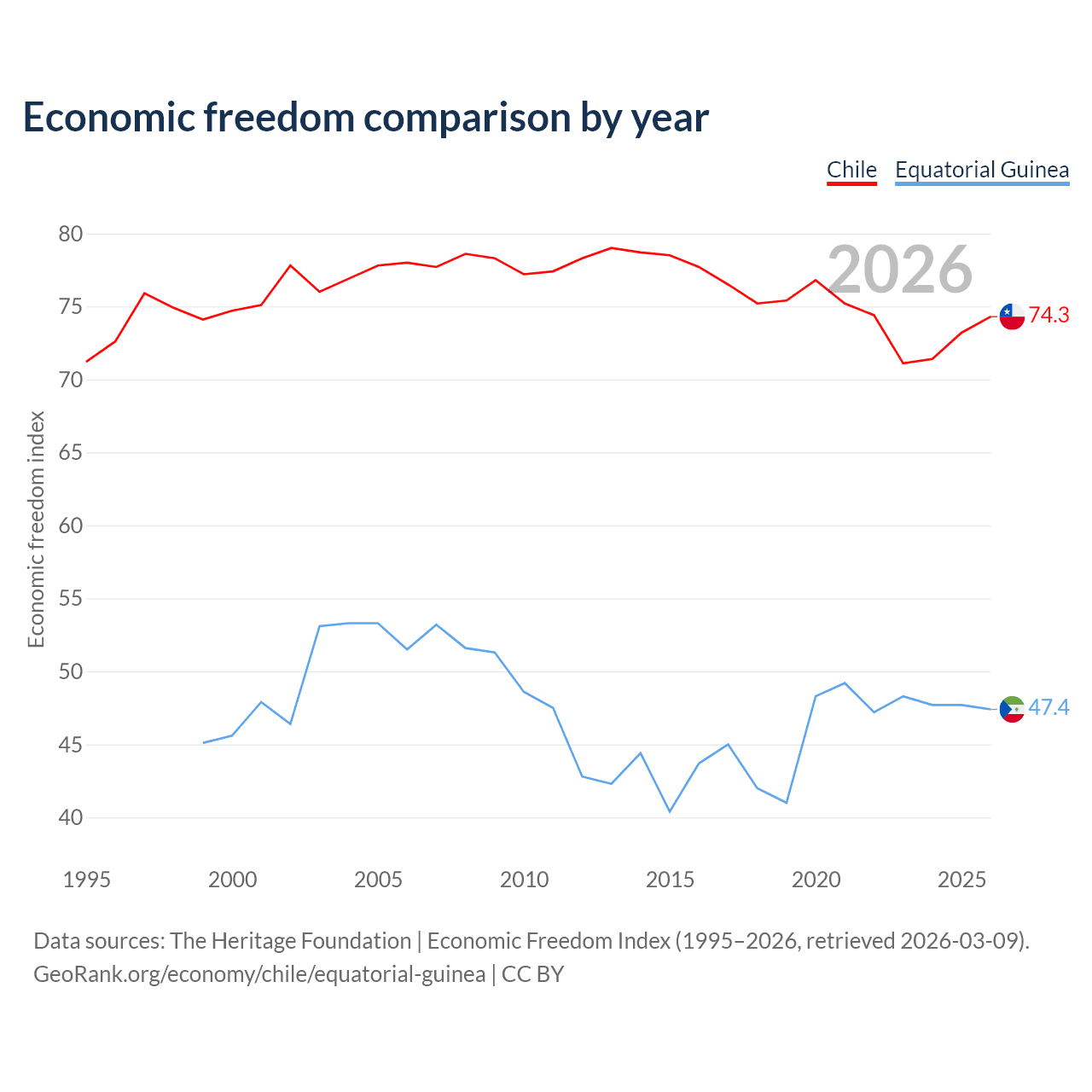 The Economic Freedom Index for Chile is 74.3, ranking 20/197, compared to 47.4 for Equatorial Guinea, ranking 175/197. The chart above displays a comparison of annual changes in economic freedom indexes.