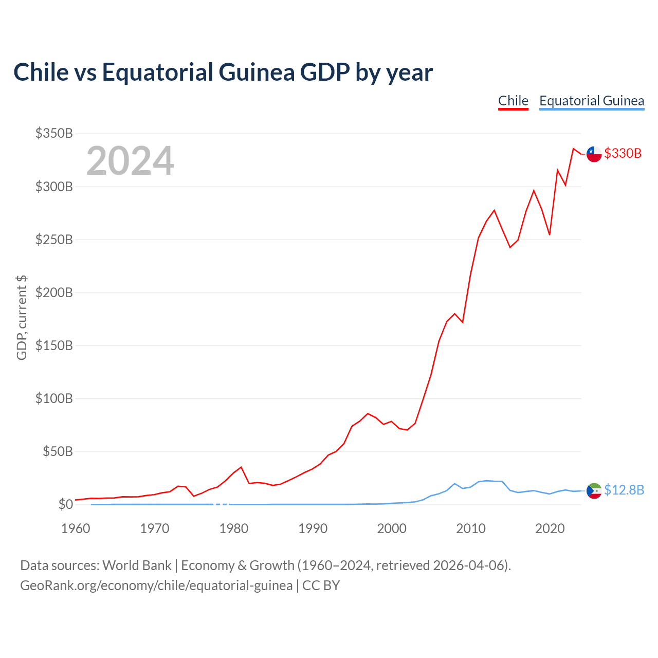 Chile has a GDP of $330B compared to $12.8B for Equatorial Guinea, ranking 45/197 and 148/197 by economy size, respectively.