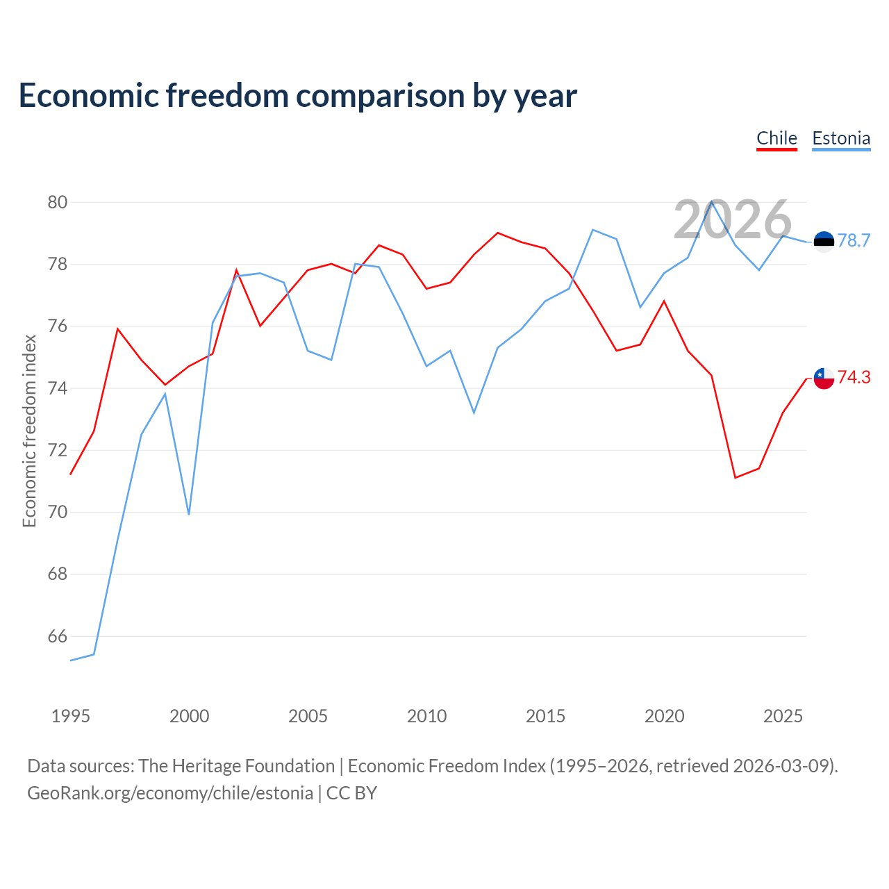 The Economic Freedom Index for Chile is 74.3, ranking 20/197, compared to 78.7 for Estonia, ranking 10/197. The chart above displays a comparison of annual changes in economic freedom indexes.