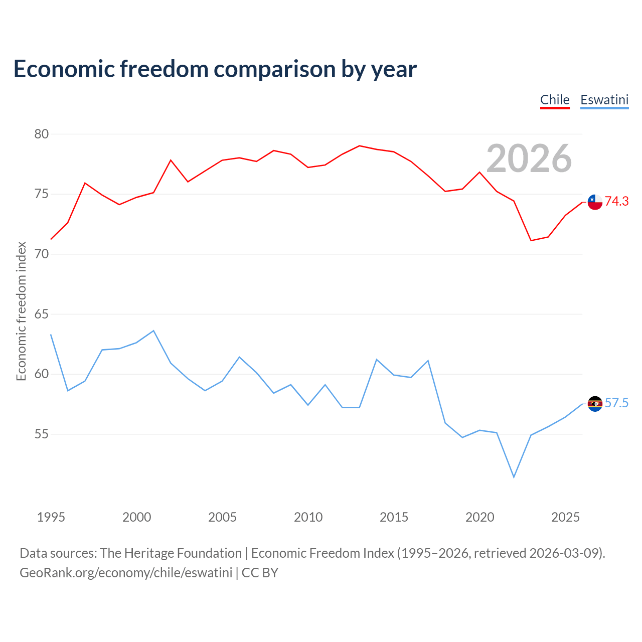 The Economic Freedom Index for Chile is 74.3, ranking 20/197, compared to 57.5 for Eswatini, ranking 116/197. The chart above displays a comparison of annual changes in economic freedom indexes.