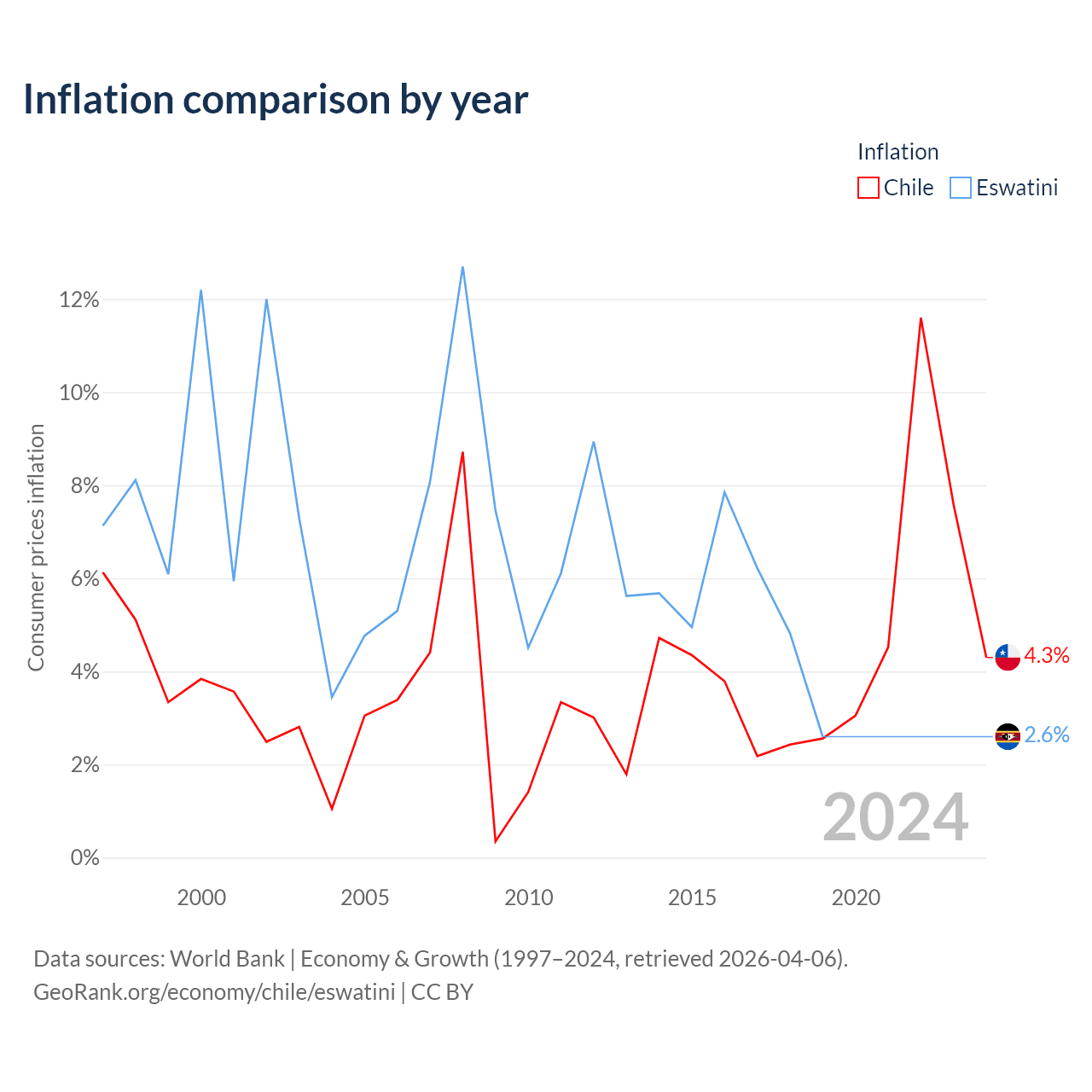 Chile has a GDP of $330B compared to $4.86B for Eswatini, ranking 45/197 and 162/197 by economy size, respectively.