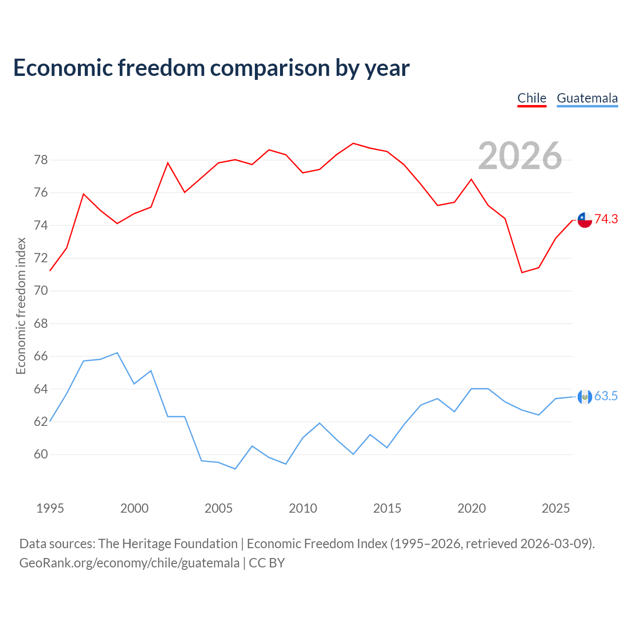 The Economic Freedom Index for Chile is 74.3, ranking 20/197, compared to 63.5 for Guatemala, ranking 79/197. The chart above displays a comparison of annual changes in economic freedom indexes.