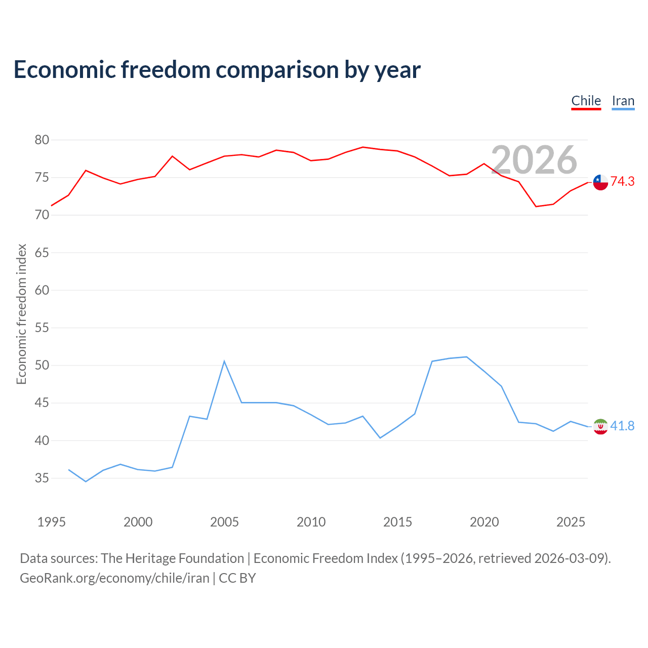 The Economic Freedom Index for Chile is 74.3, ranking 20/197, compared to 41.8 for Iran, ranking 185/197. The chart above displays a comparison of annual changes in economic freedom indexes.