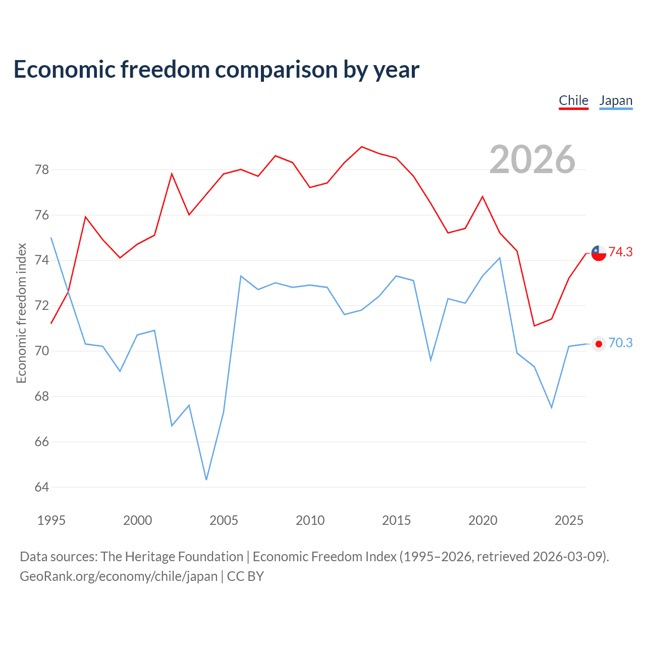 The Economic Freedom Index for Chile is 74.3, ranking 20/197, compared to 70.3 for Japan, ranking 36/197. The chart above displays a comparison of annual changes in economic freedom indexes.