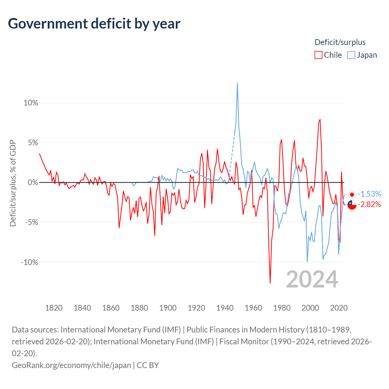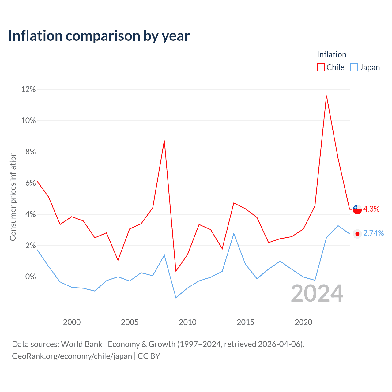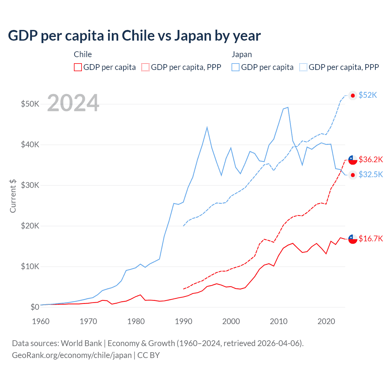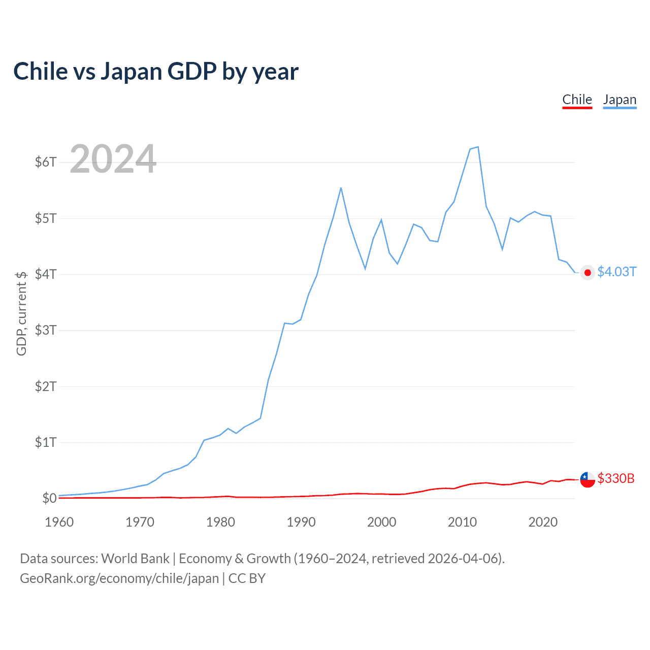 Chile has a GDP of $330B compared to $4.03T for Japan, ranking 45/197 and 4/197 by economy size, respectively.