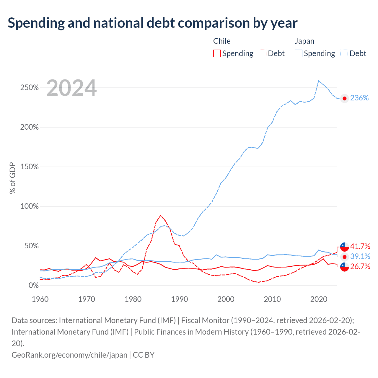 Chile has $138B in government debt (41.7% of GDP), compared to $9.51T (236.1% of GDP) in Japan.
