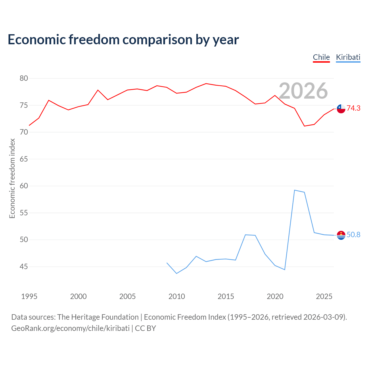 The Economic Freedom Index for Chile is 74.3, ranking 20/197, compared to 50.8 for Kiribati, ranking 158/197. The chart above displays a comparison of annual changes in economic freedom indexes.