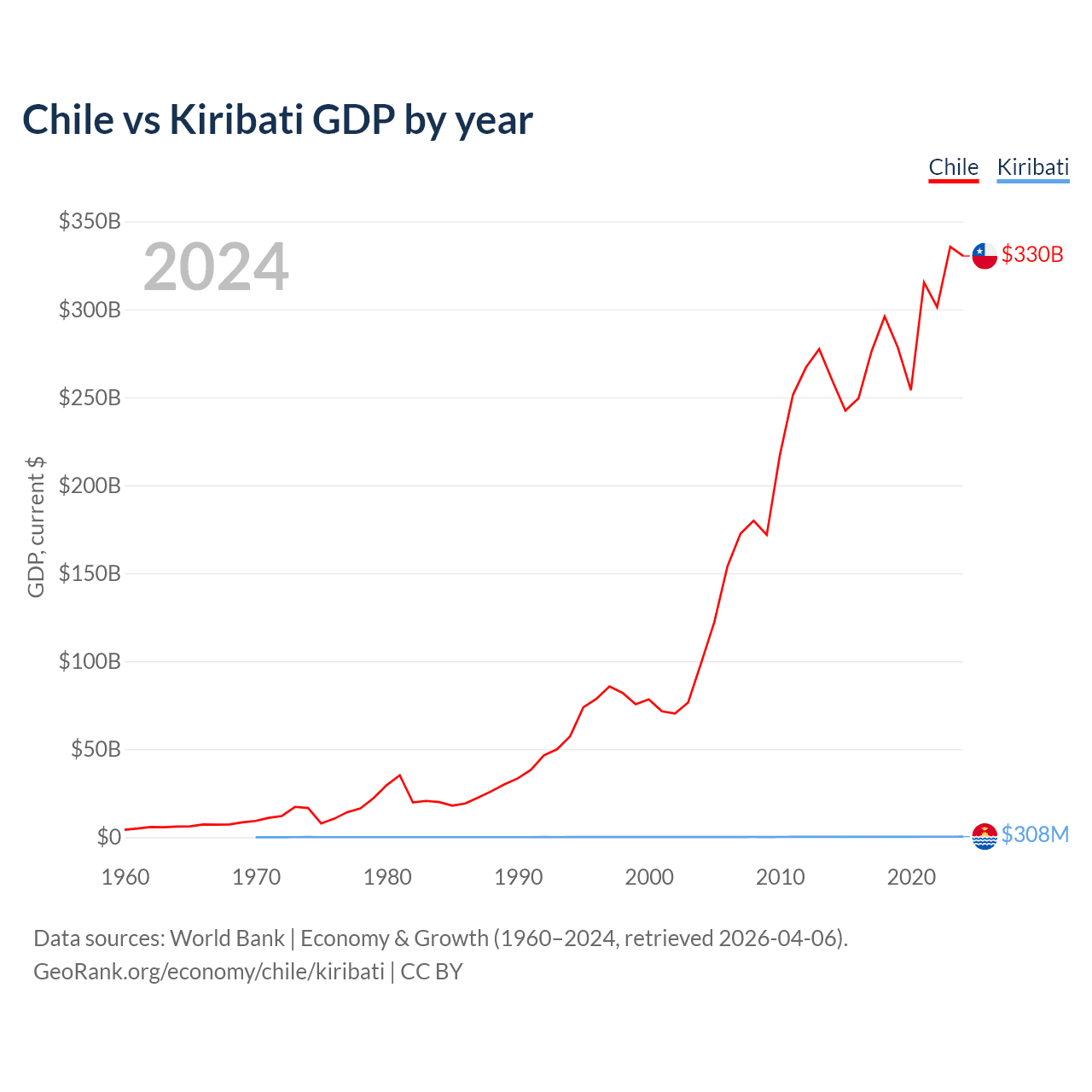 Chile has a GDP of $330B compared to $308M for Kiribati, ranking 45/197 and 192/197 by economy size, respectively.