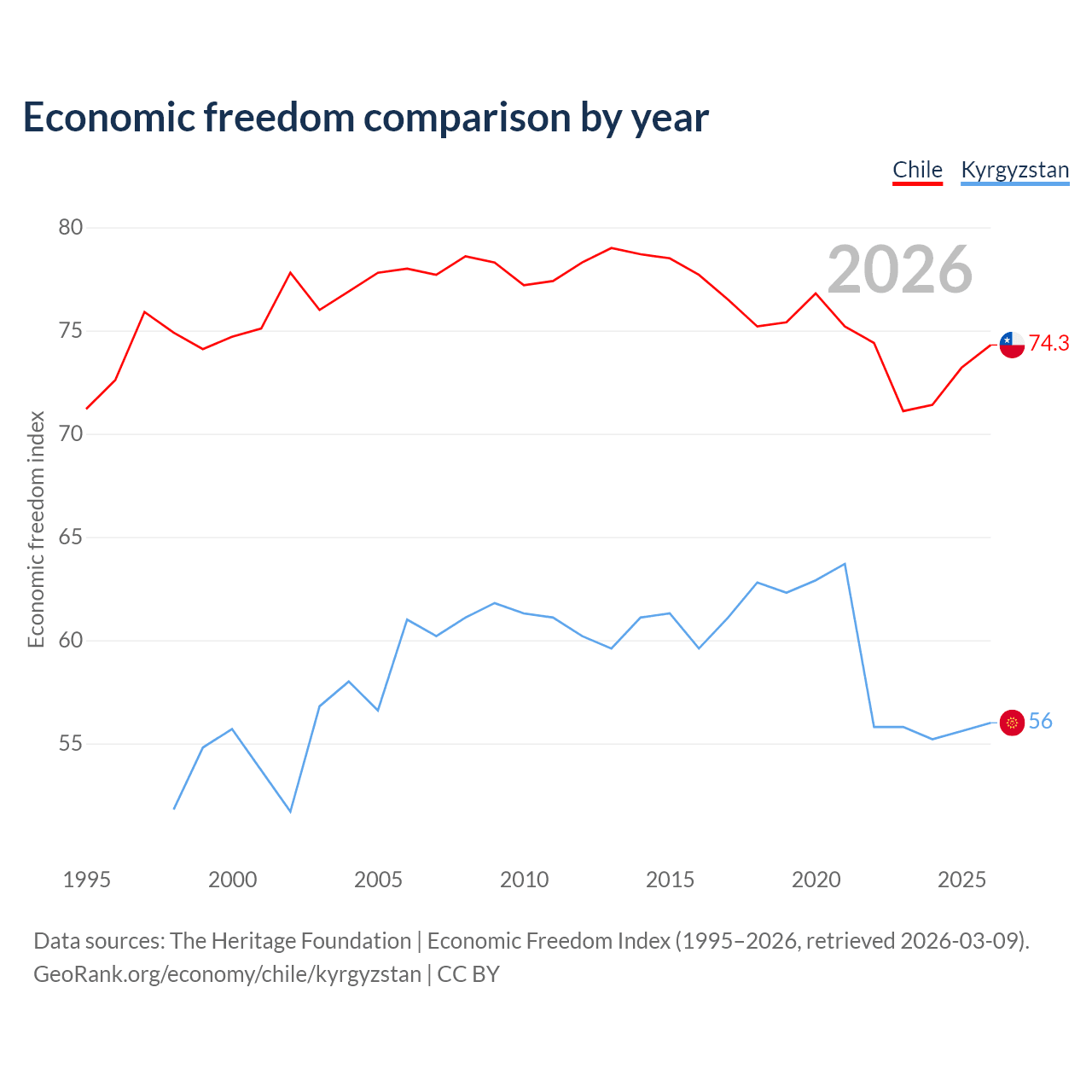 The Economic Freedom Index for Chile is 74.3, ranking 20/197, compared to 56 for Kyrgyzstan, ranking 126/197. The chart above displays a comparison of annual changes in economic freedom indexes.