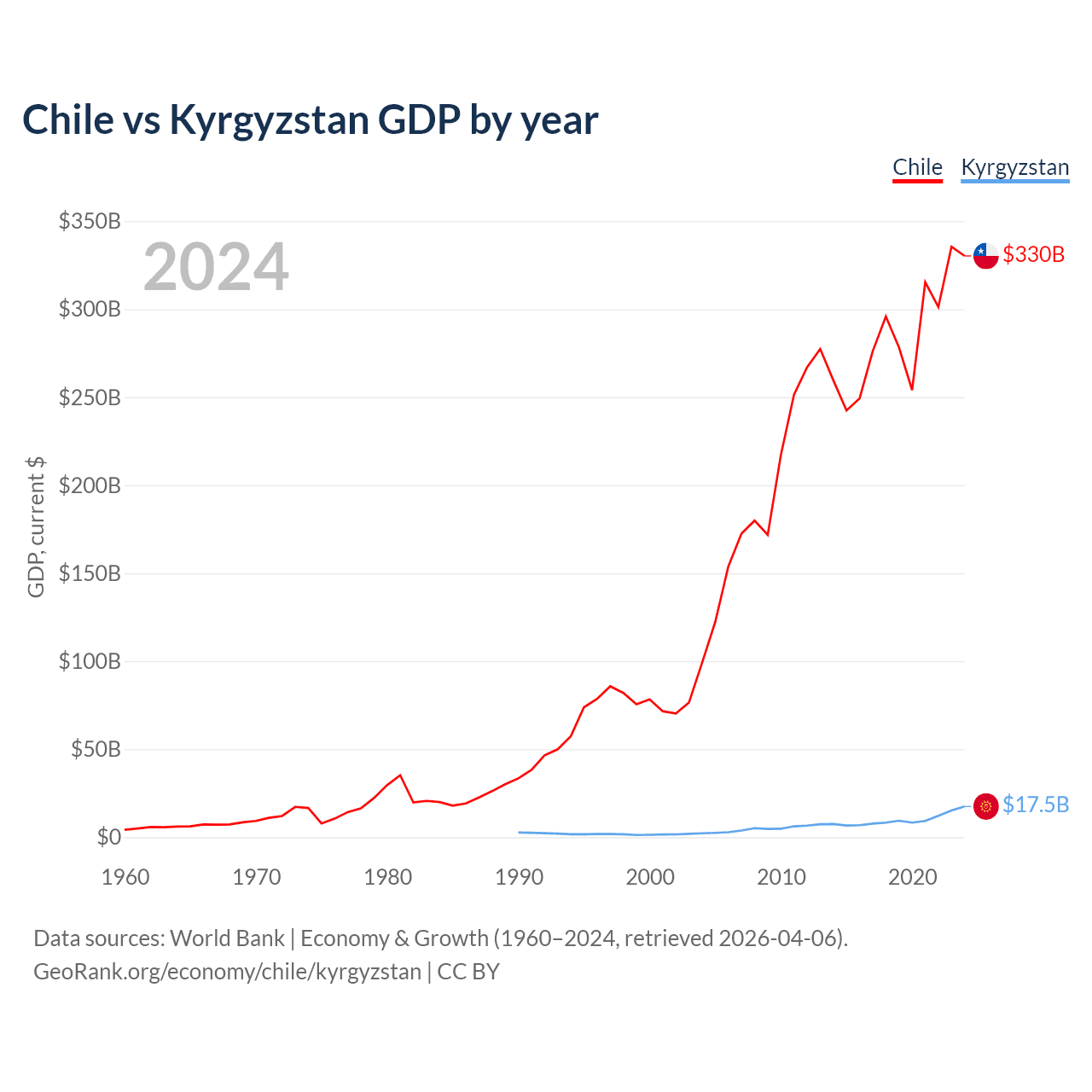 Chile has a GDP of $330B compared to $17.5B for Kyrgyzstan, ranking 45/197 and 135/197 by economy size, respectively.