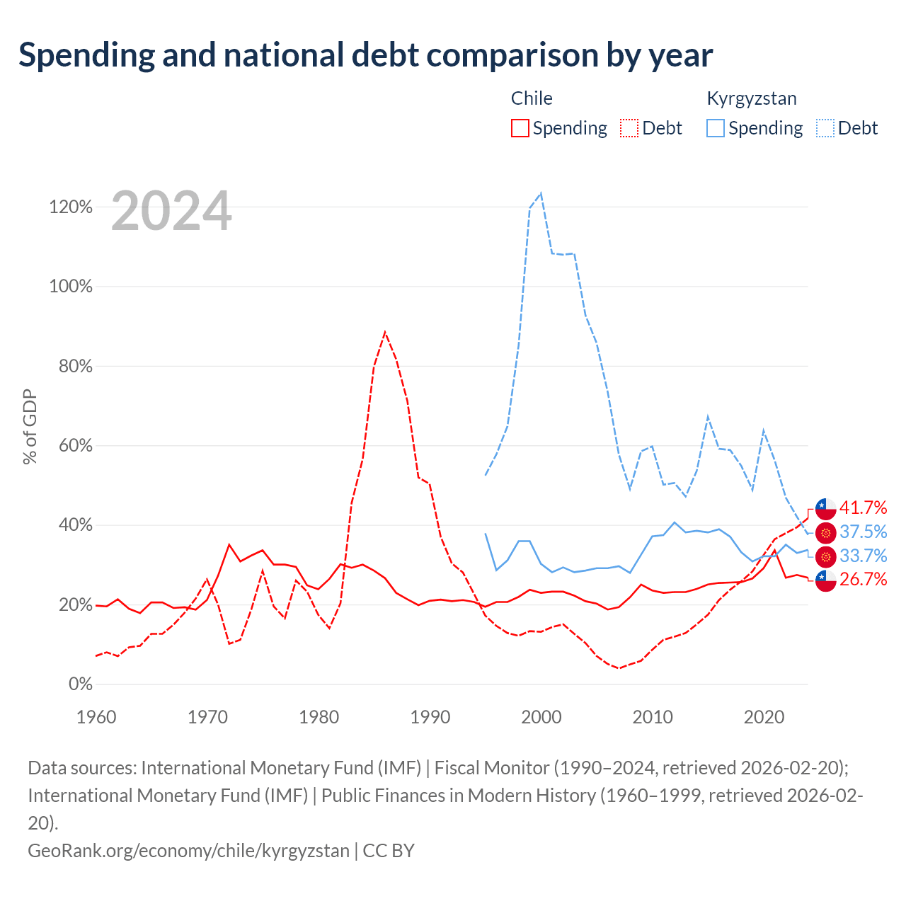 Chile has $138B in government debt (41.7% of GDP), compared to $6.56B (37.5% of GDP) in Kyrgyzstan.