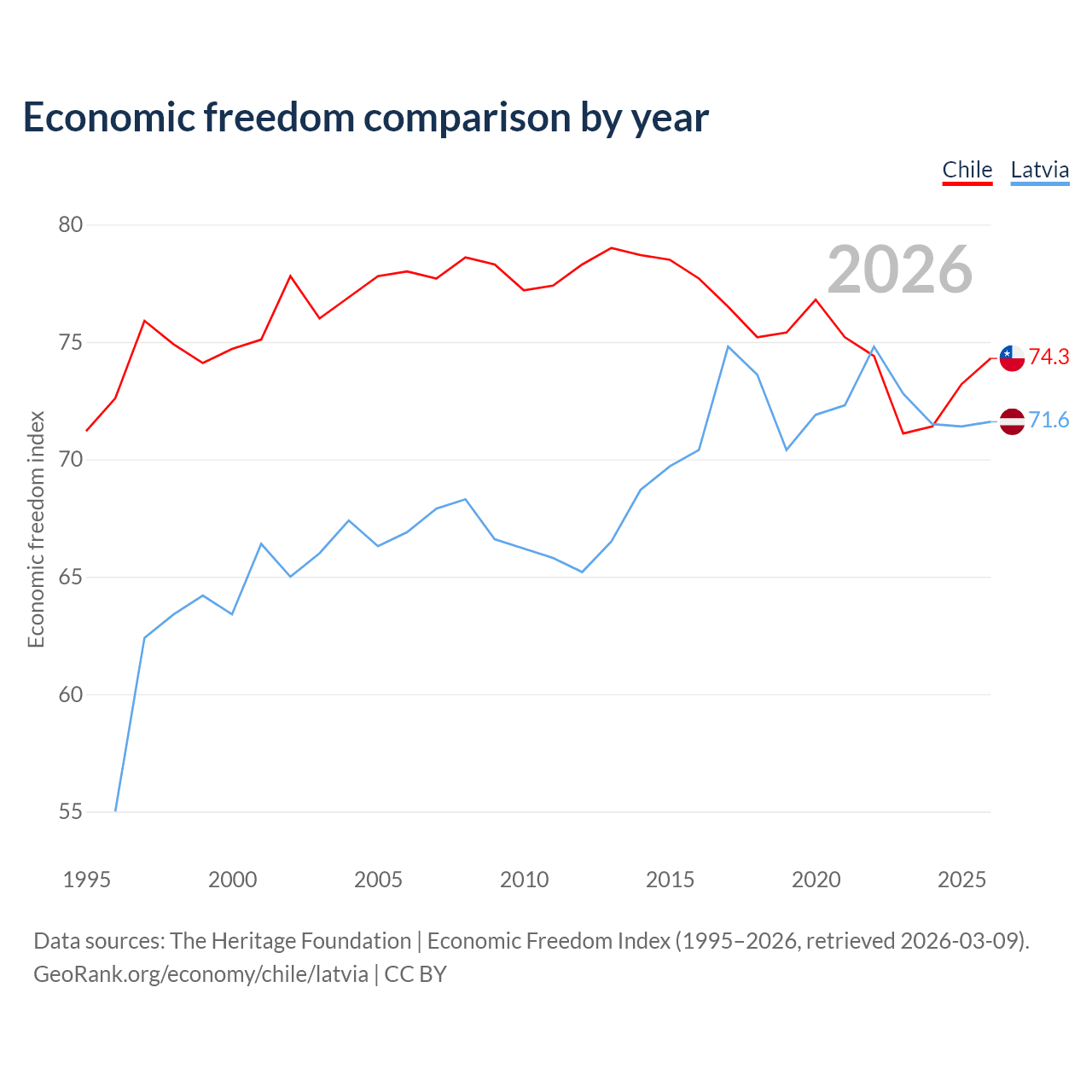 The Economic Freedom Index for Chile is 74.3, ranking 20/197, compared to 71.6 for Latvia, ranking 31/197. The chart above displays a comparison of annual changes in economic freedom indexes.