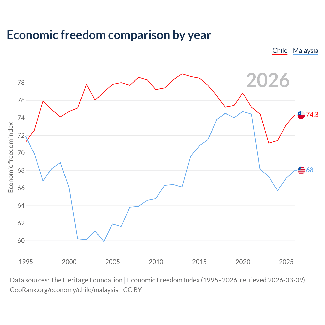 Data sources: The Heritage Foundation | Economic Freedom Index (1995–2026, retrieved 2026-03-09).