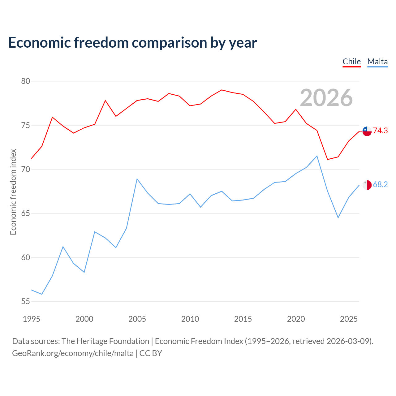 The Economic Freedom Index for Chile is 74.3, ranking 20/197, compared to 68.2 for Malta, ranking 49/197. The chart above displays a comparison of annual changes in economic freedom indexes.