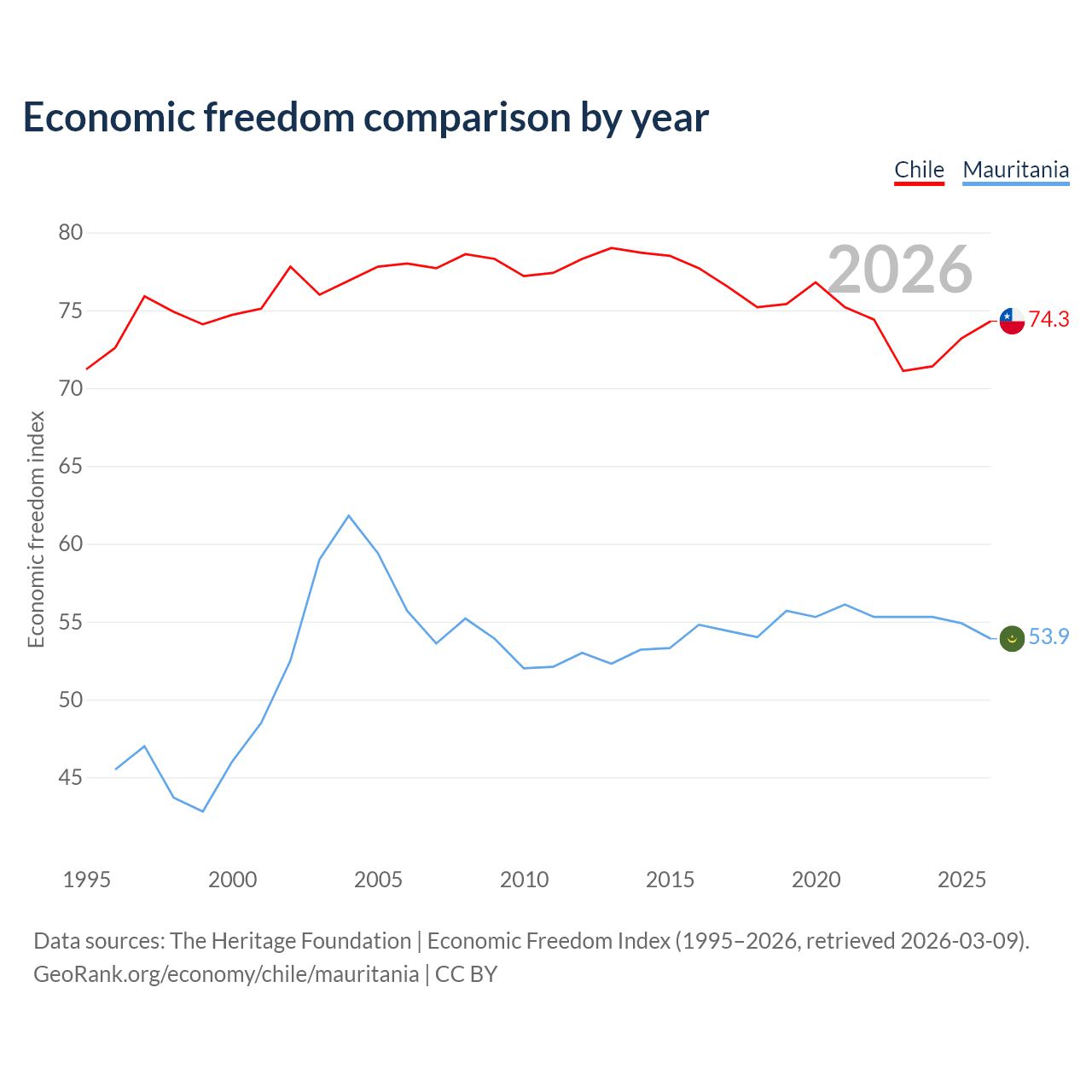 The Economic Freedom Index for Chile is 74.3, ranking 20/197, compared to 53.9 for Mauritania, ranking 136/197. The chart above displays a comparison of annual changes in economic freedom indexes.