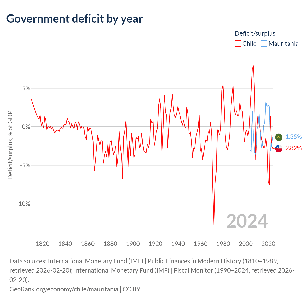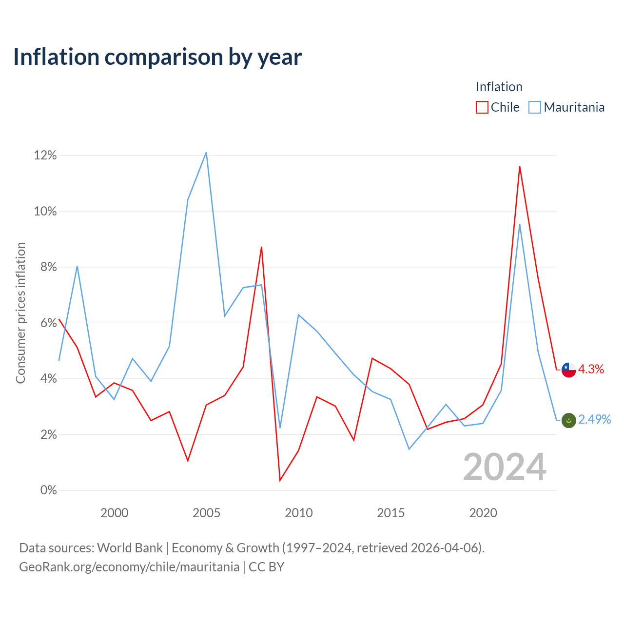 Chile has a GDP of $330B compared to $10.9B for Mauritania, ranking 45/197 and 153/197 by economy size, respectively.