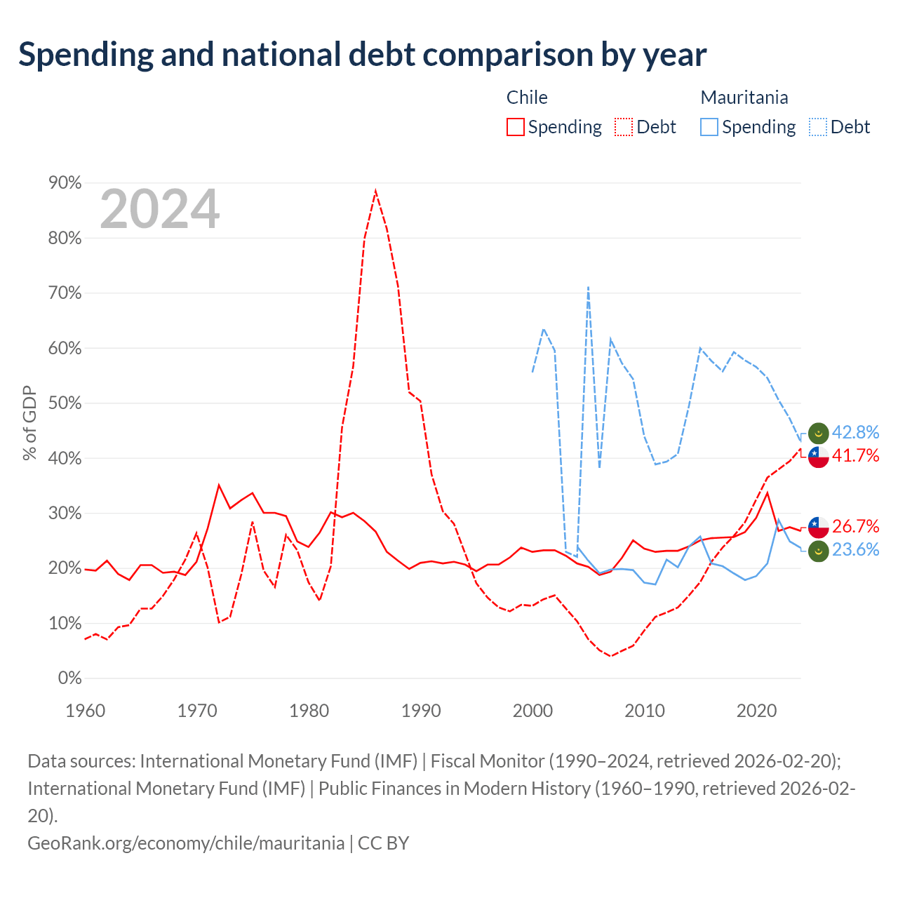 Chile has $138B in government debt (41.7% of GDP), compared to $4.67B (42.8% of GDP) in Mauritania.