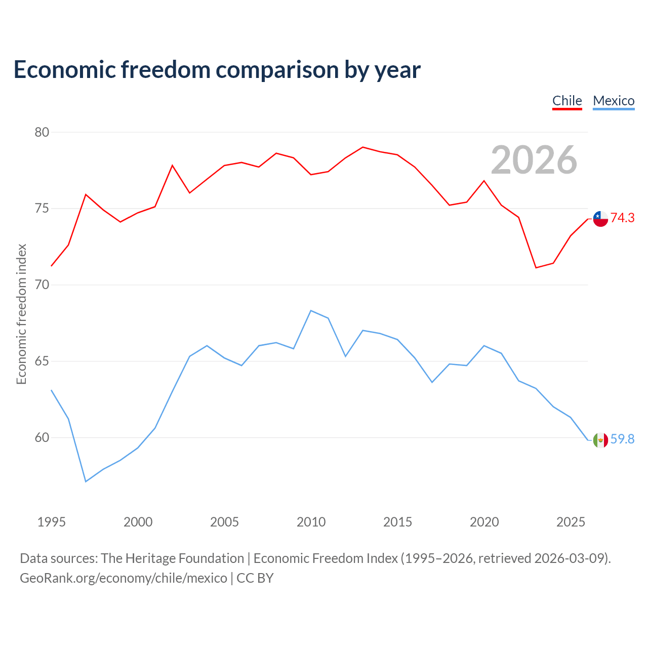 The Economic Freedom Index for Chile is 74.3, ranking 20/197, compared to 59.8 for Mexico, ranking 102/197. The chart above displays a comparison of annual changes in economic freedom indexes.