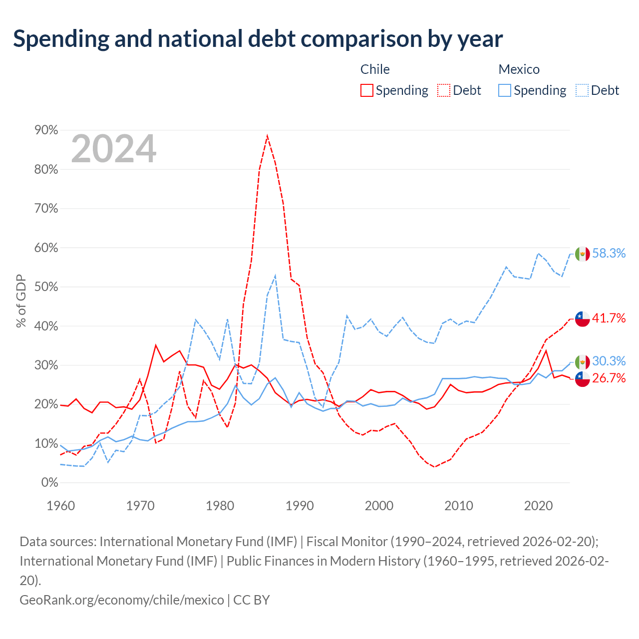 Chile has $138B in government debt (41.7% of GDP), compared to $1.08T (58.3% of GDP) in Mexico.