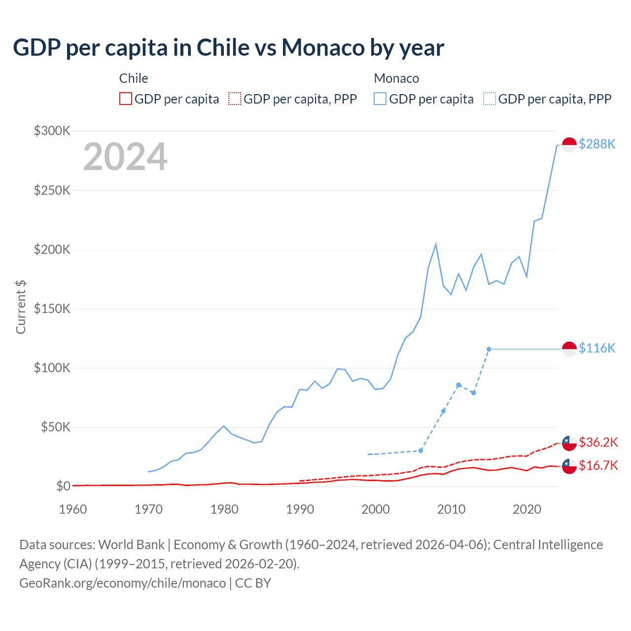 Chile has a GDP of $330B compared to $11.1B for Monaco, ranking 45/197 and 152/197 by economy size, respectively.