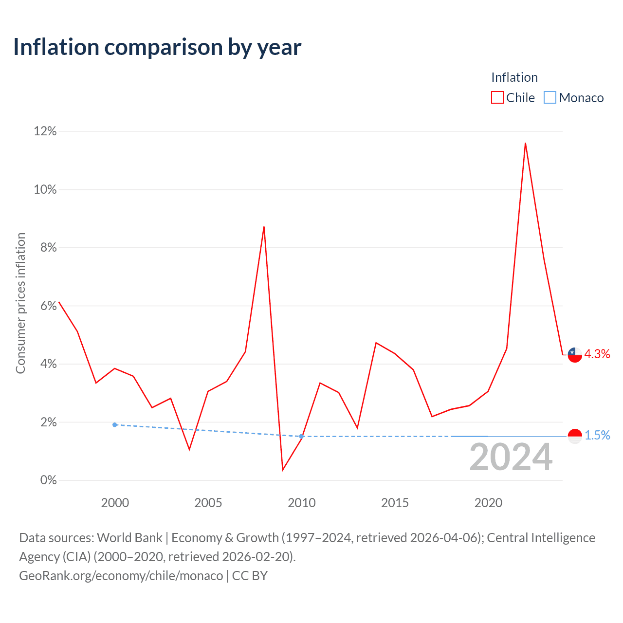 Over the past 21 years, Chile has recorded an average annual inflation rate of 3.16%, compared with 1.58% in Monaco. In 2020, inflation was 4.3% in Chile and 1.5% in Monaco.