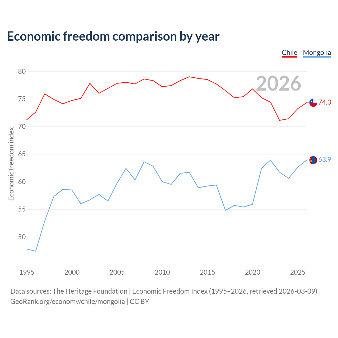 The Economic Freedom Index for Chile is 74.3, ranking 20/197, compared to 63.9 for Mongolia, ranking 76/197. The chart above displays a comparison of annual changes in economic freedom indexes.
