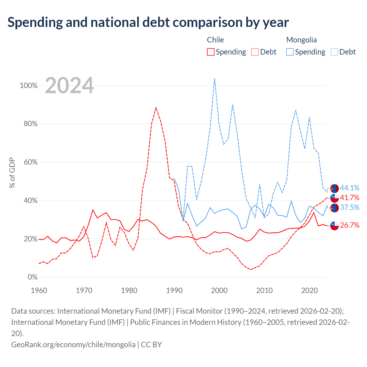 Chile has $138B in government debt (41.7% of GDP), compared to $10.5B (44.1% of GDP) in Mongolia.