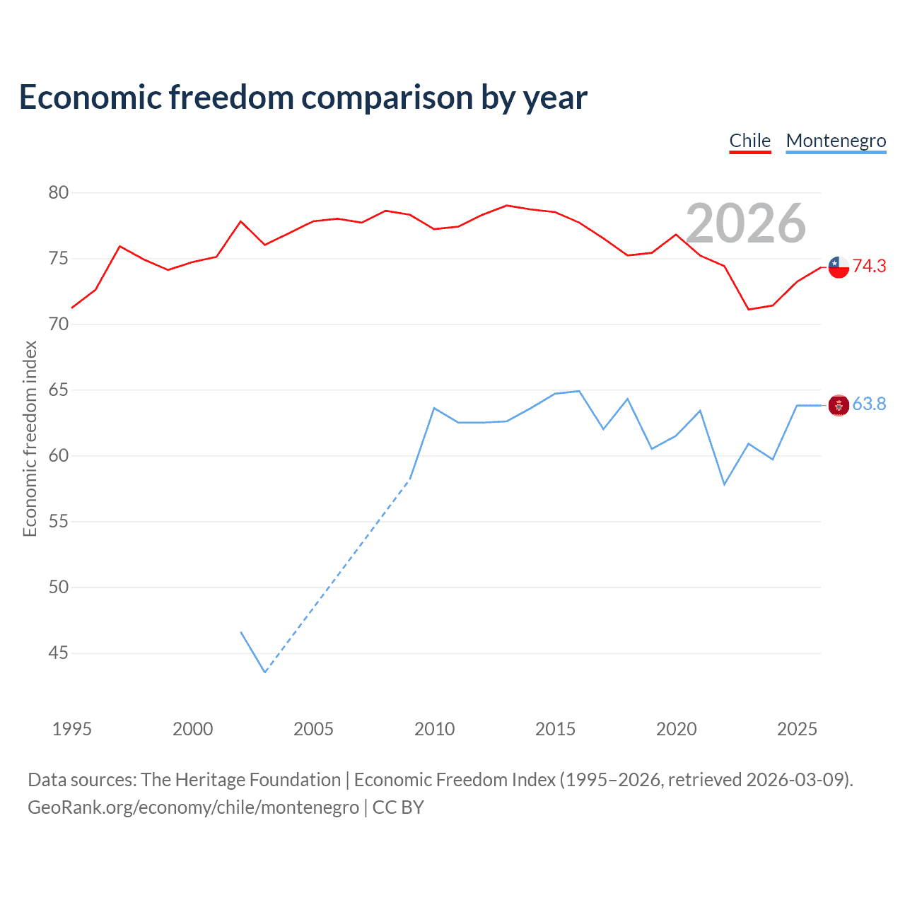 The Economic Freedom Index for Chile is 74.3, ranking 20/197, compared to 63.8 for Montenegro, ranking 78/197. The chart above displays a comparison of annual changes in economic freedom indexes.