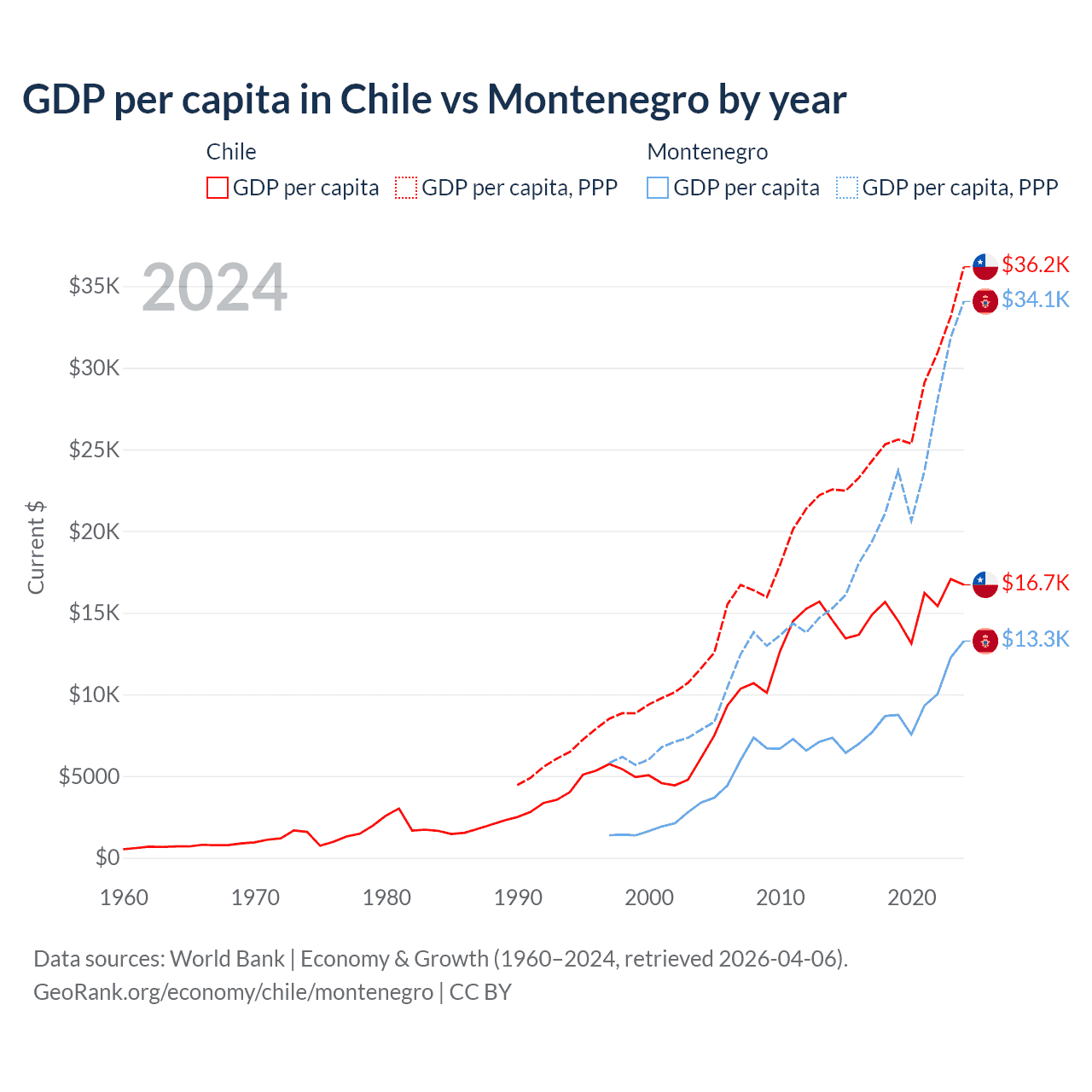 GDP per capita in Chile vs Montenegro by year