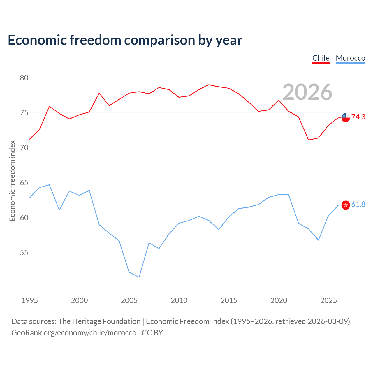 The Economic Freedom Index for Chile is 74.3, ranking 20/197, compared to 61.8 for Morocco, ranking 91/197. The chart above displays a comparison of annual changes in economic freedom indexes.