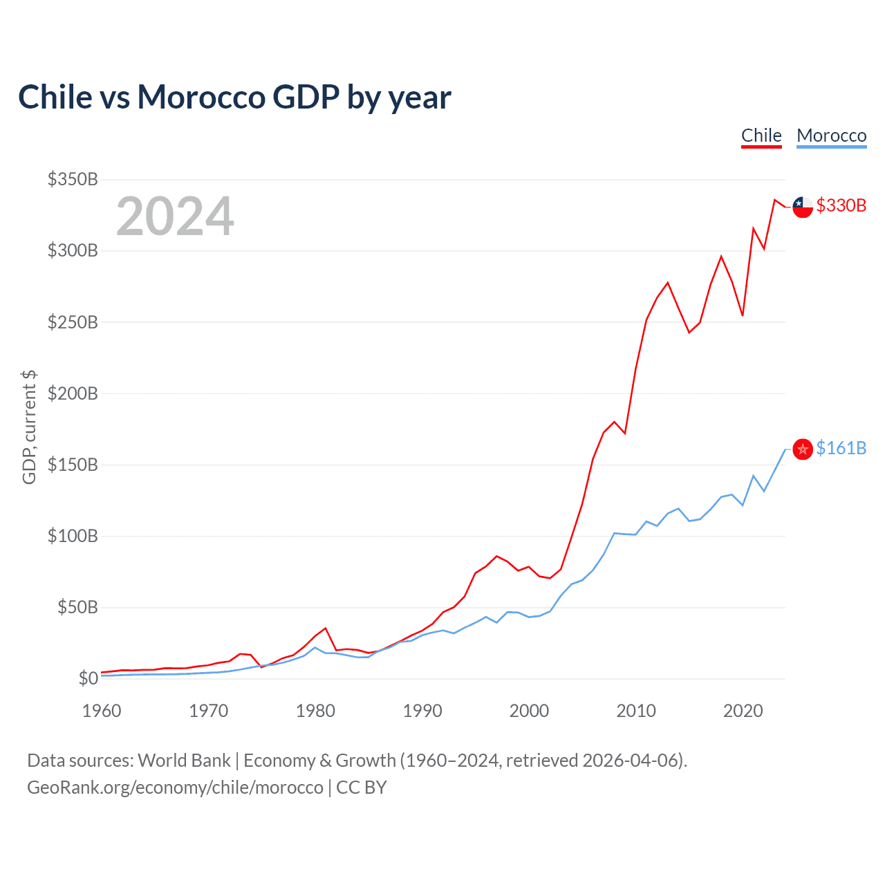Chile has a GDP of $330B compared to $161B for Morocco, ranking 45/197 and 58/197 by economy size, respectively.