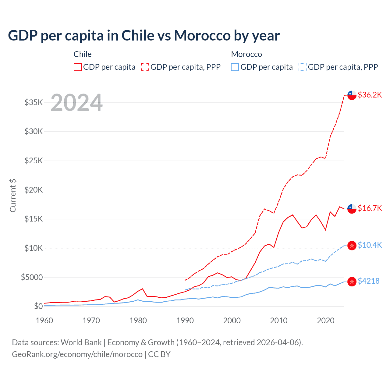 GDP per capita in Chile vs Morocco by year