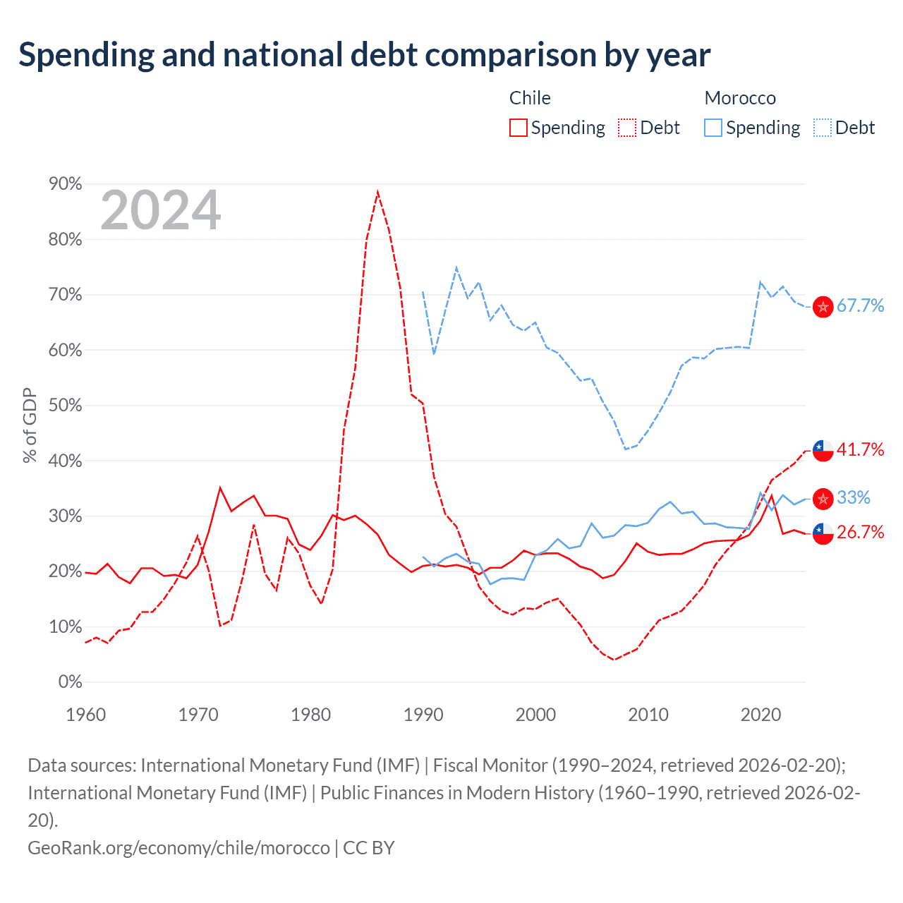 Chile has $138B in government debt (41.7% of GDP), compared to $109B (67.7% of GDP) in Morocco.