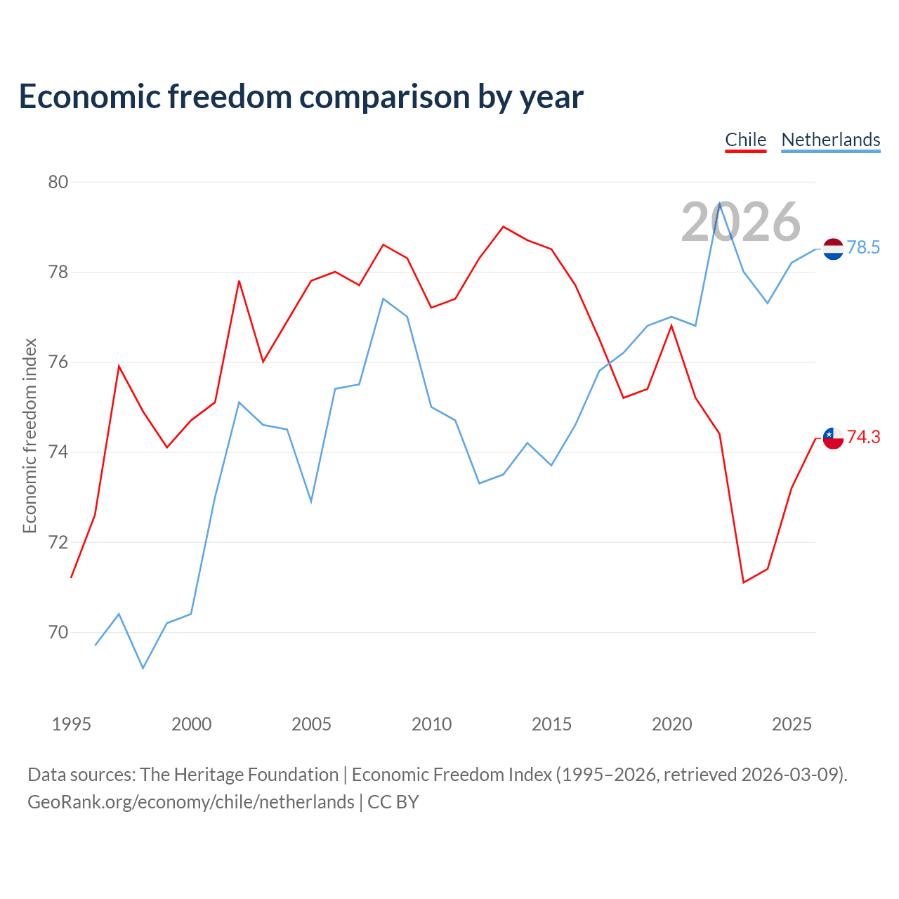 The Economic Freedom Index for Chile is 74.3, ranking 20/197, compared to 78.5 for the Netherlands, ranking 11/197. The chart above displays a comparison of annual changes in economic freedom indexes.