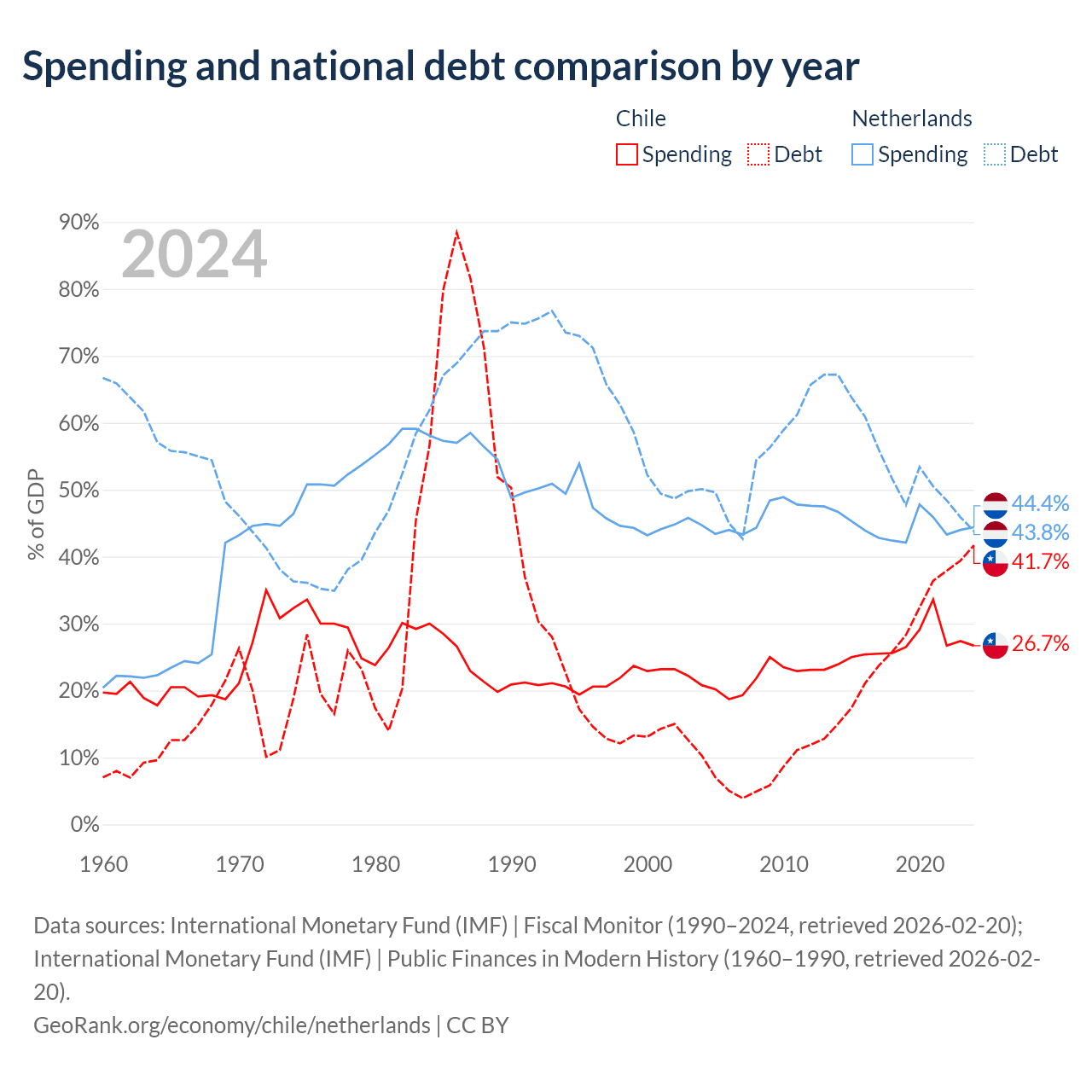 Chile has $138B in government debt (41.7% of GDP), compared to $532B (43.8% of GDP) in the Netherlands.