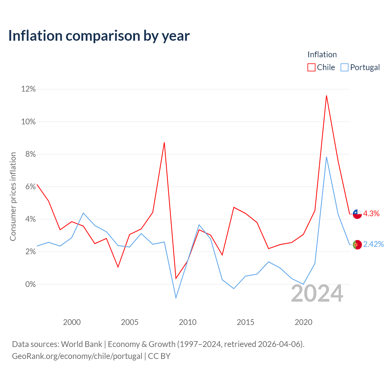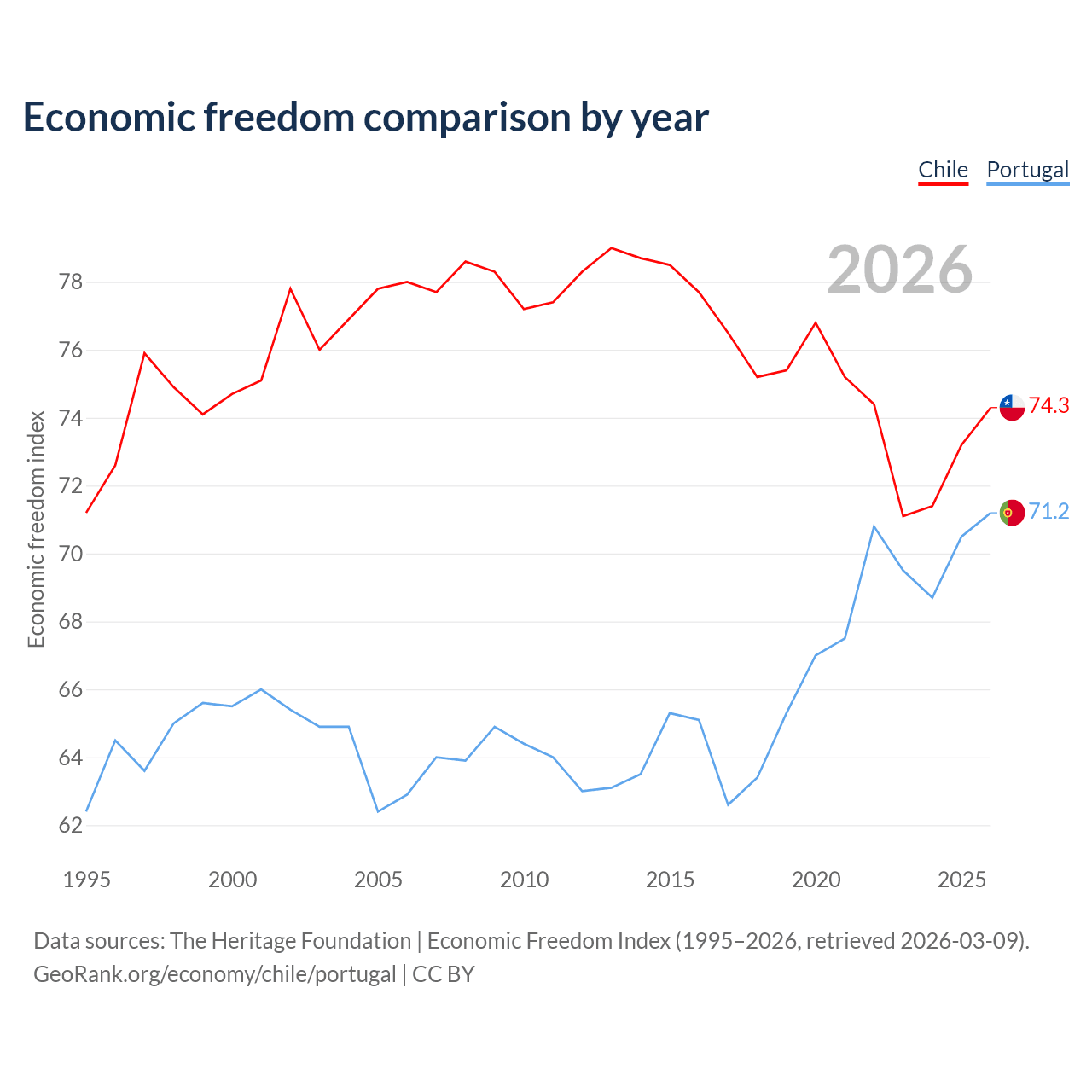 The Economic Freedom Index for Chile is 74.3, ranking 20/197, compared to 71.2 for Portugal, ranking 33/197. The chart above displays a comparison of annual changes in economic freedom indexes.