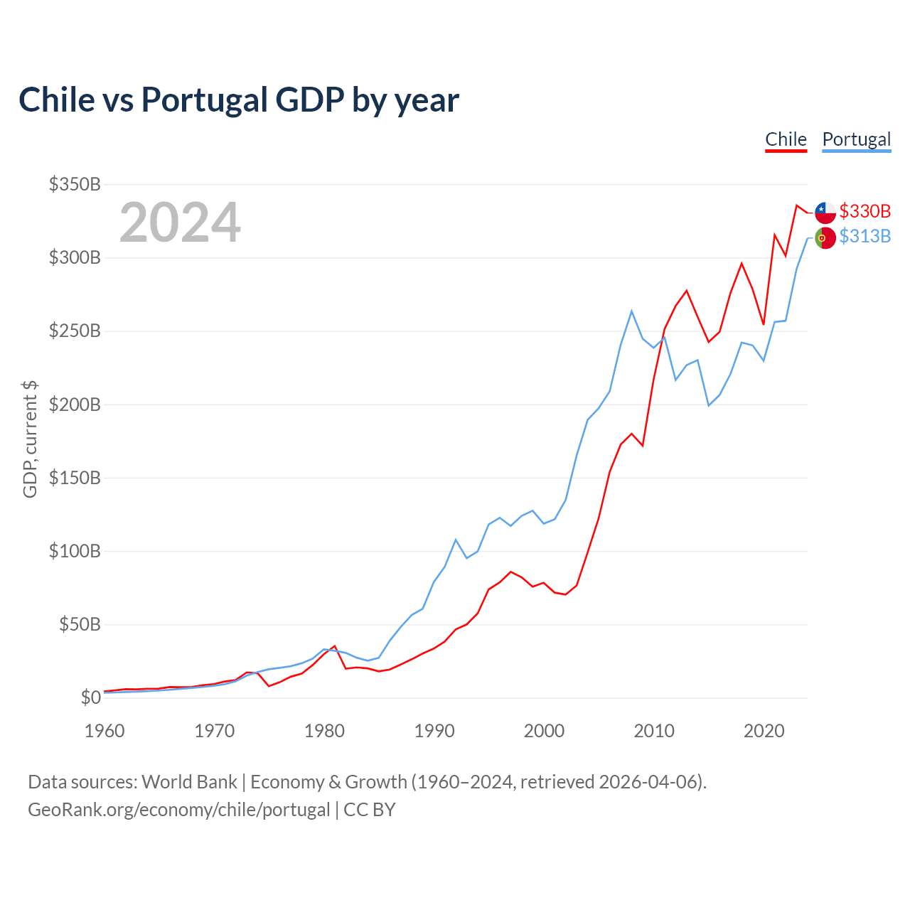 Chile has a GDP of $330B compared to $313B for Portugal, ranking 45/197 and 46/197 by economy size, respectively.