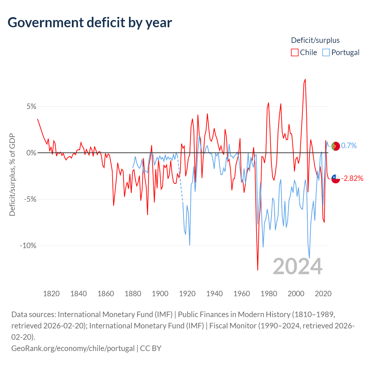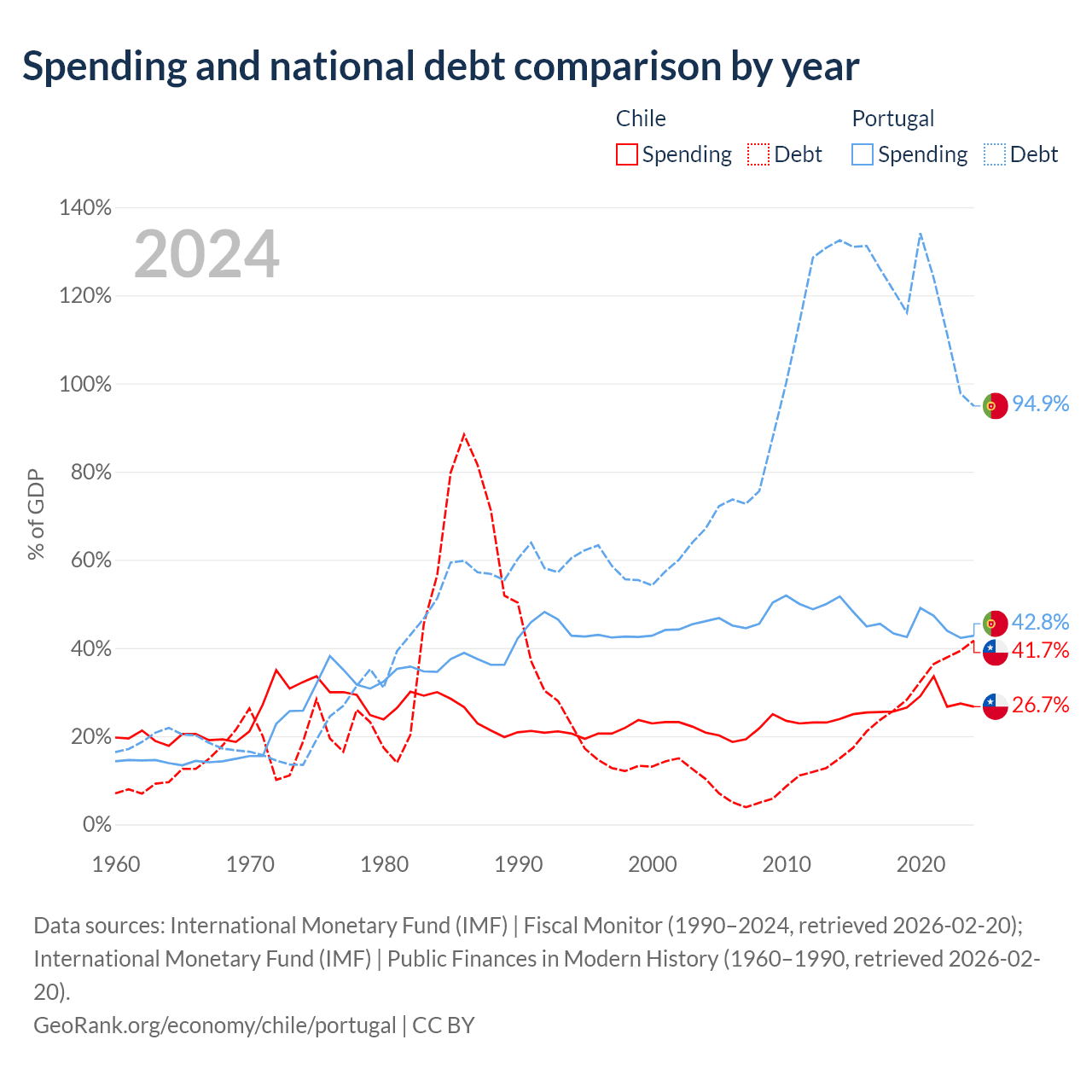 Chile has $138B in government debt (41.7% of GDP), compared to $297B (94.9% of GDP) in Portugal.