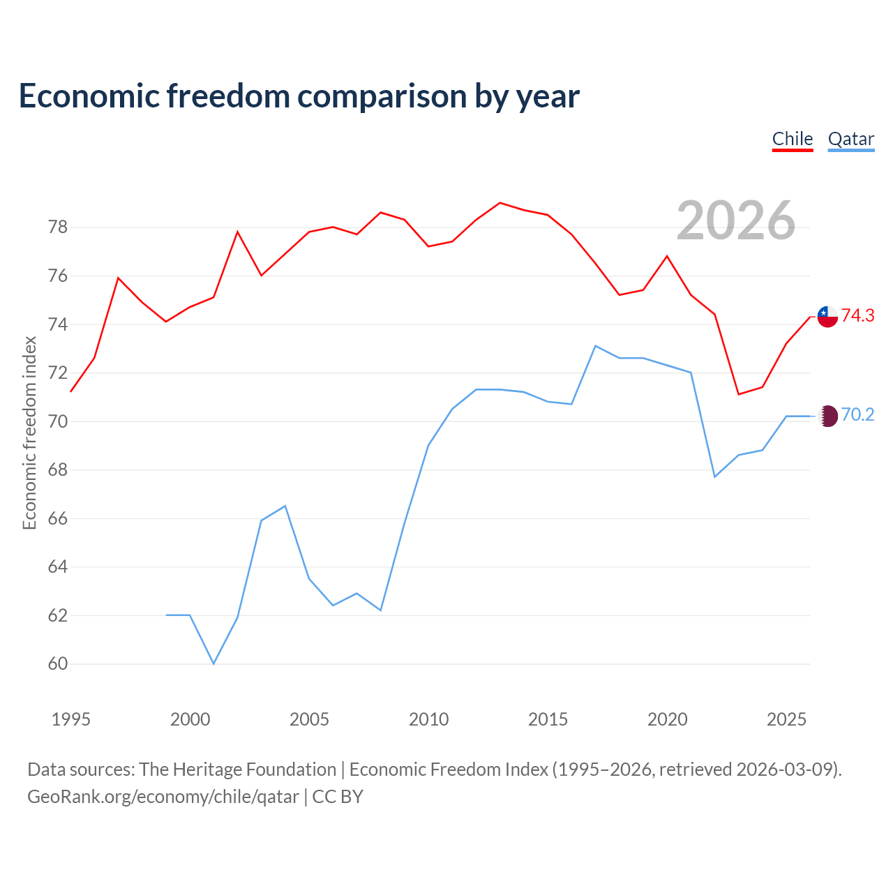 The Economic Freedom Index for Chile is 74.3, ranking 20/197, compared to 70.2 for Qatar, ranking 37/197. The chart above displays a comparison of annual changes in economic freedom indexes.