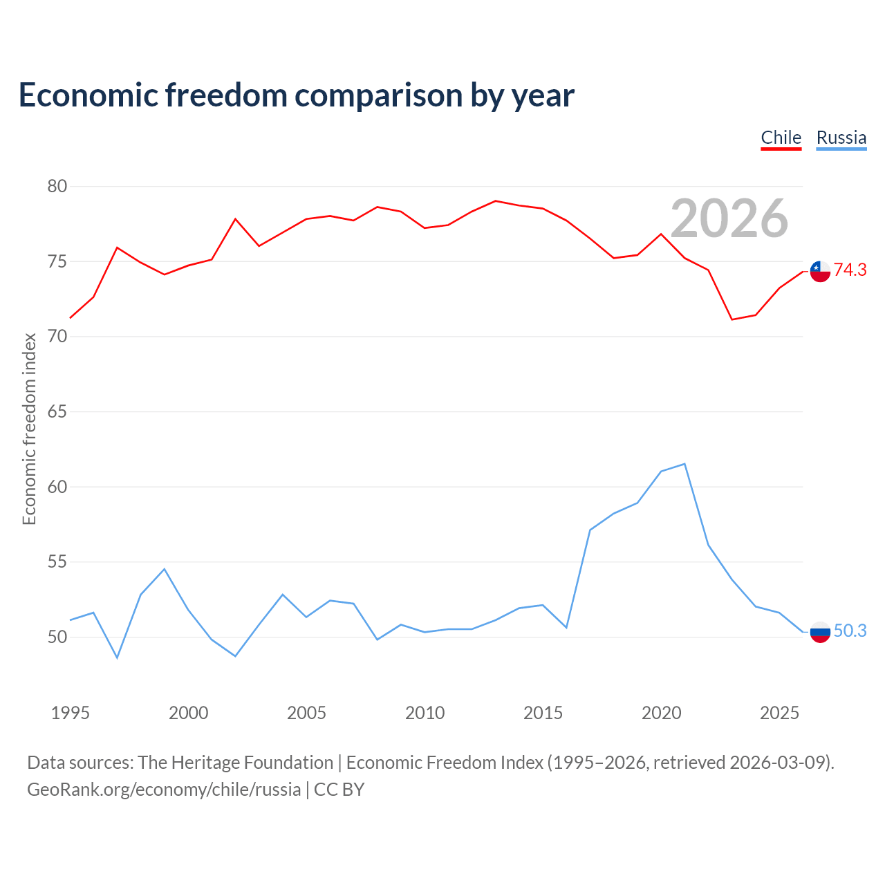 The Economic Freedom Index for Chile is 74.3, ranking 20/197, compared to 50.3 for Russia, ranking 161/197. The chart above displays a comparison of annual changes in economic freedom indexes.