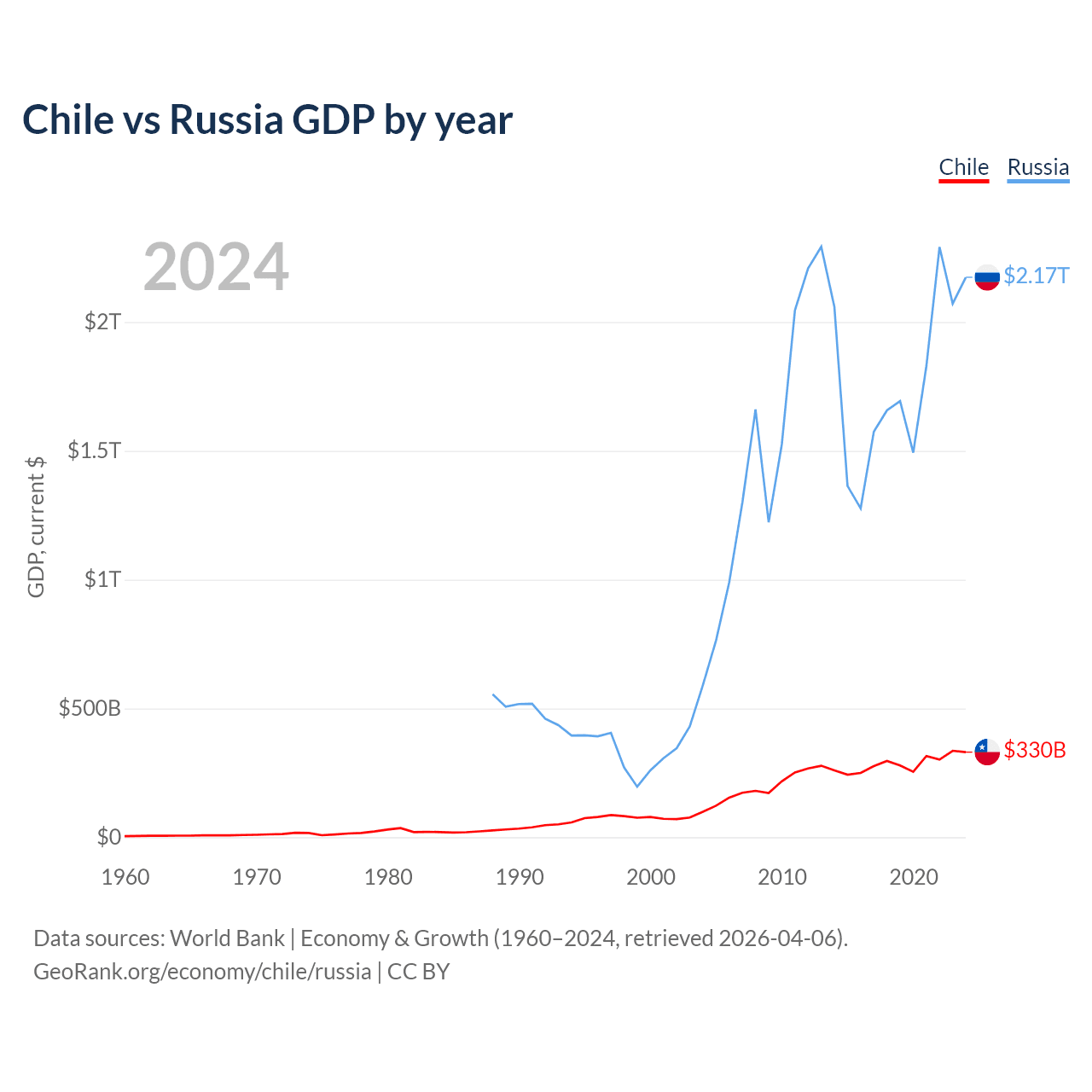 Chile has a GDP of $330B compared to $2.17T for Russia, ranking 45/197 and 11/197 by economy size, respectively.