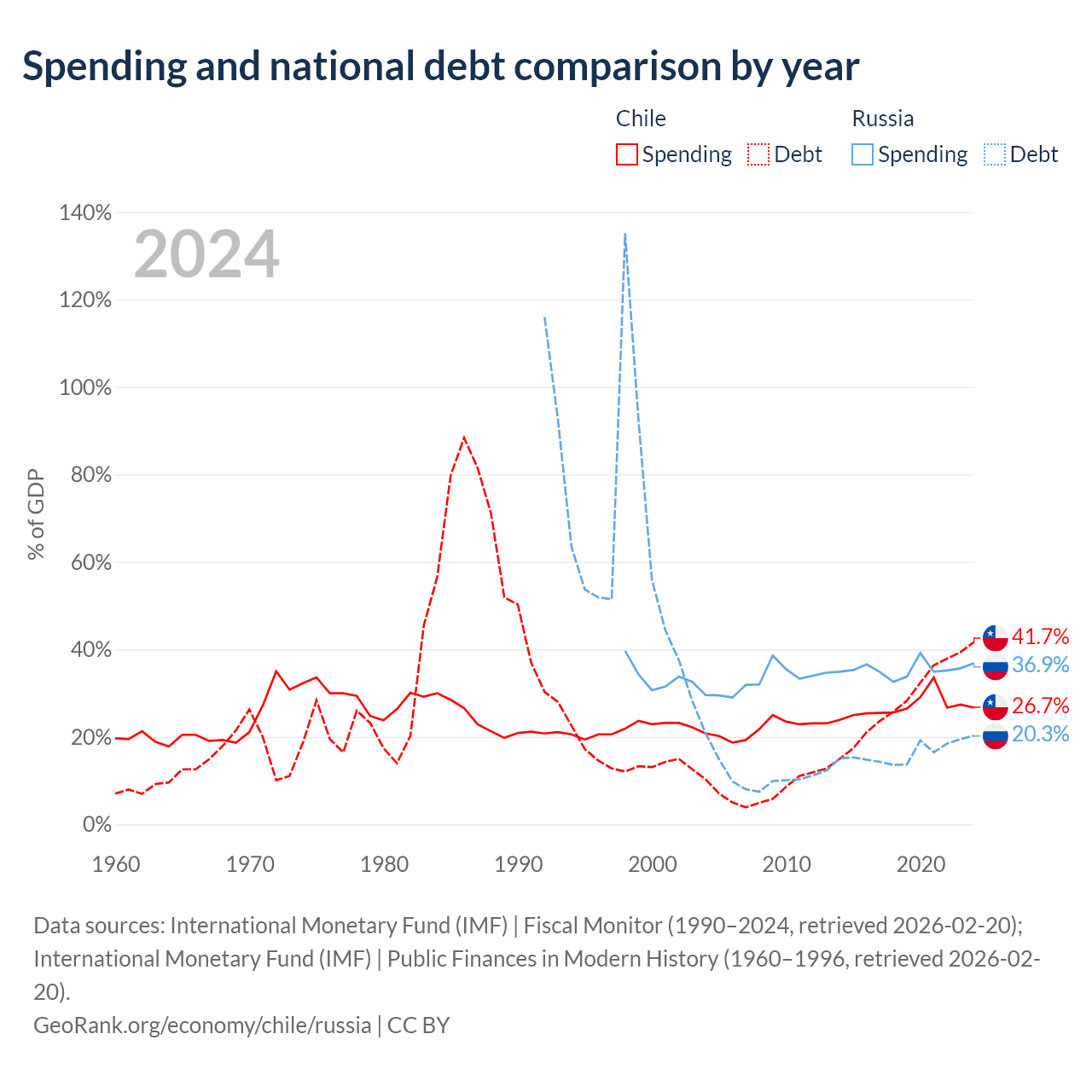 Chile has $138B in government debt (41.7% of GDP), compared to $440B (20.3% of GDP) in Russia.