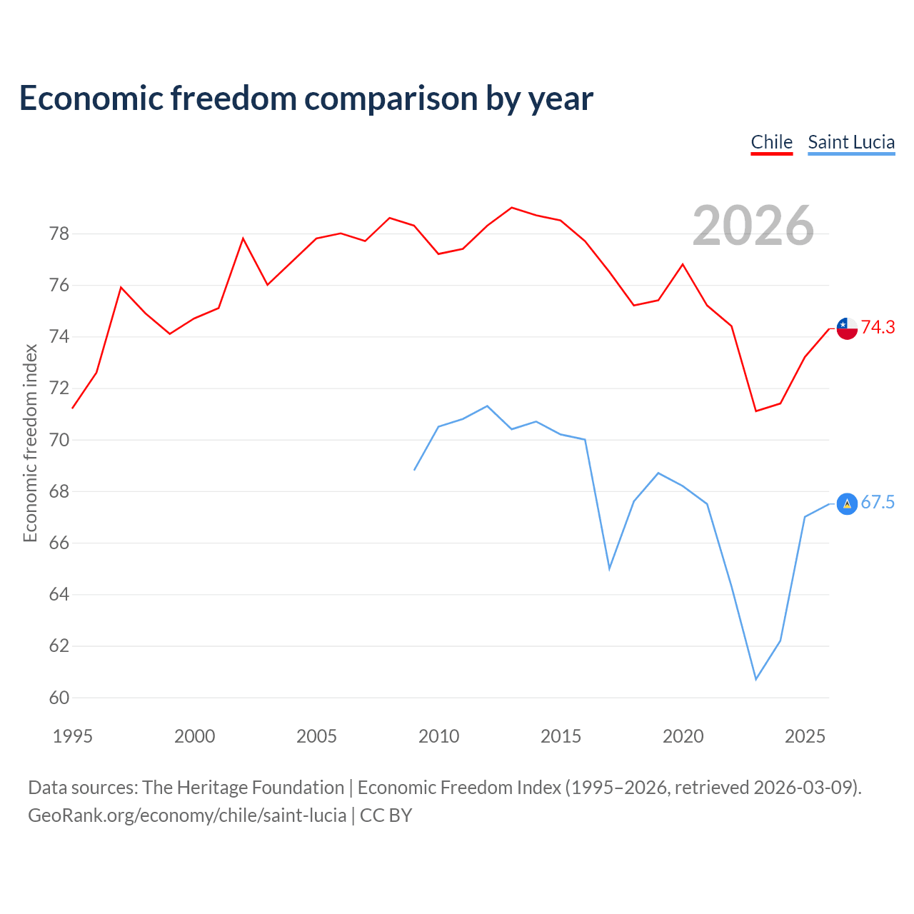 The Economic Freedom Index for Chile is 74.3, ranking 20/197, compared to 67.5 for Saint Lucia, ranking 57/197. The chart above displays a comparison of annual changes in economic freedom indexes.