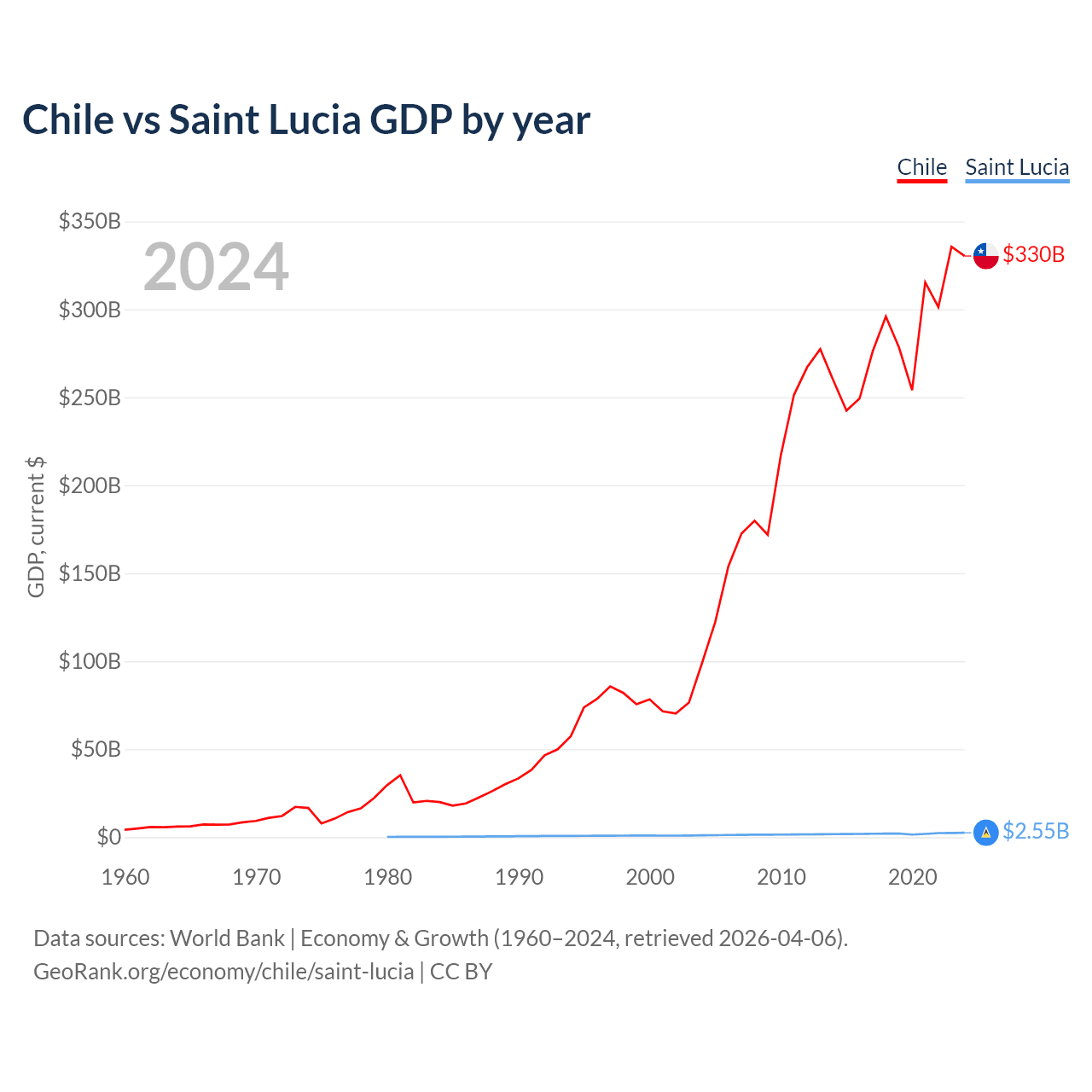 Chile has a GDP of $330B compared to $2.55B for Saint Lucia, ranking 45/197 and 173/197 by economy size, respectively.