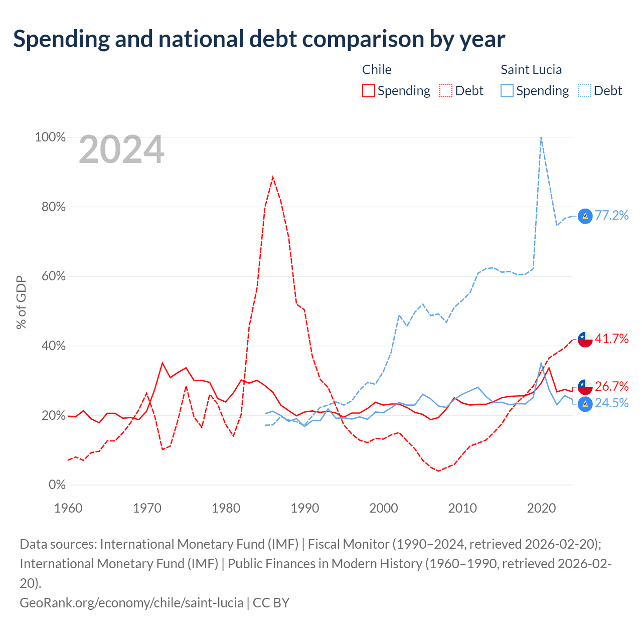 Chile has $138B in government debt (41.7% of GDP), compared to $1.97B (77.2% of GDP) in Saint Lucia.
