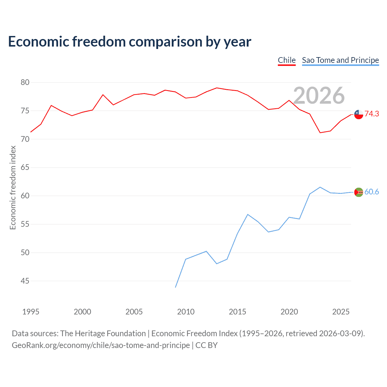 The Economic Freedom Index for Chile is 74.3, ranking 20/197, compared to 60.6 for Sao Tome and Principe, ranking 93/197. The chart above displays a comparison of annual changes in economic freedom indexes.