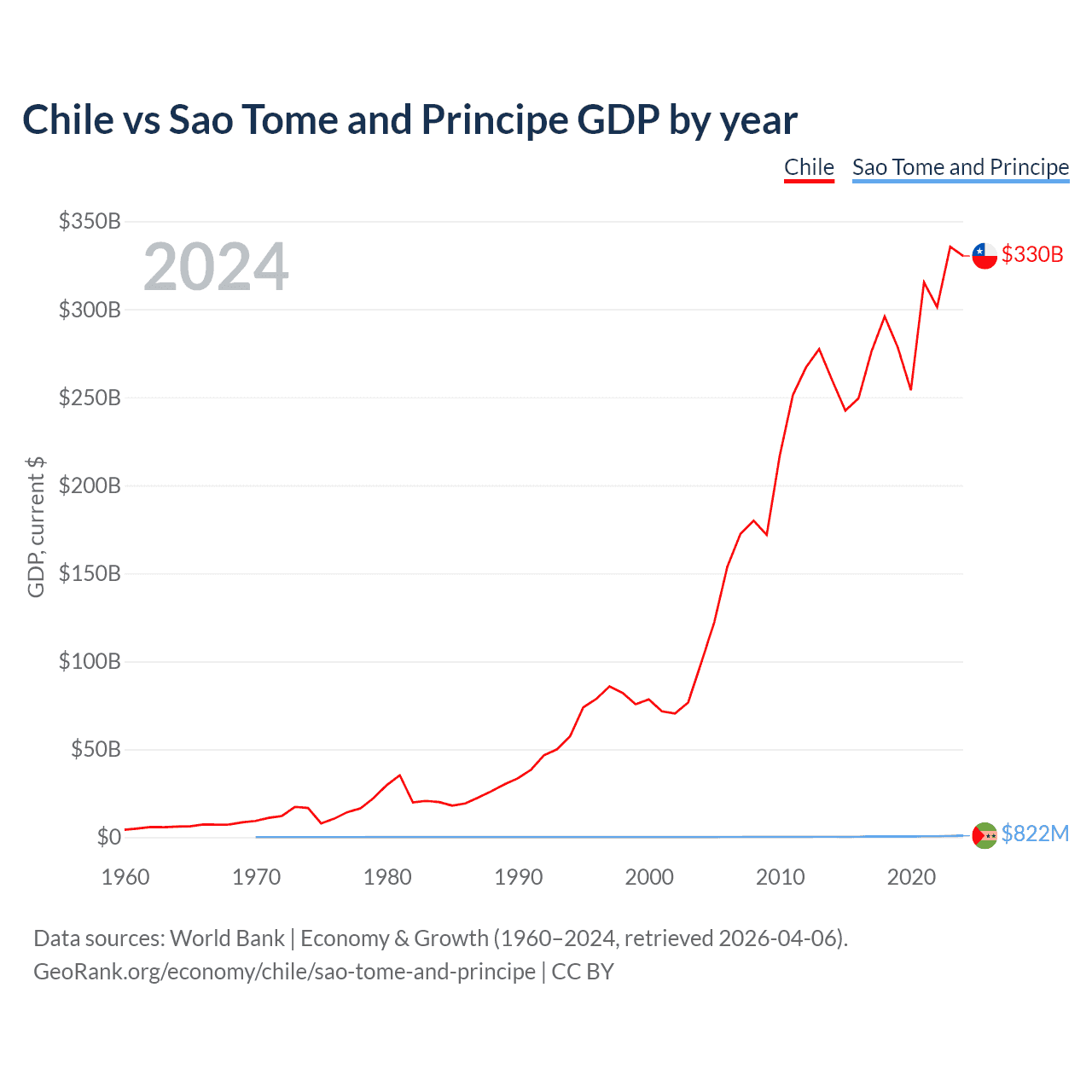 Chile has a GDP of $330B compared to $822M for Sao Tome and Principe, ranking 45/197 and 189/197 by economy size, respectively.